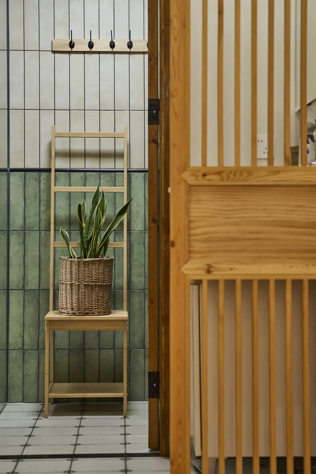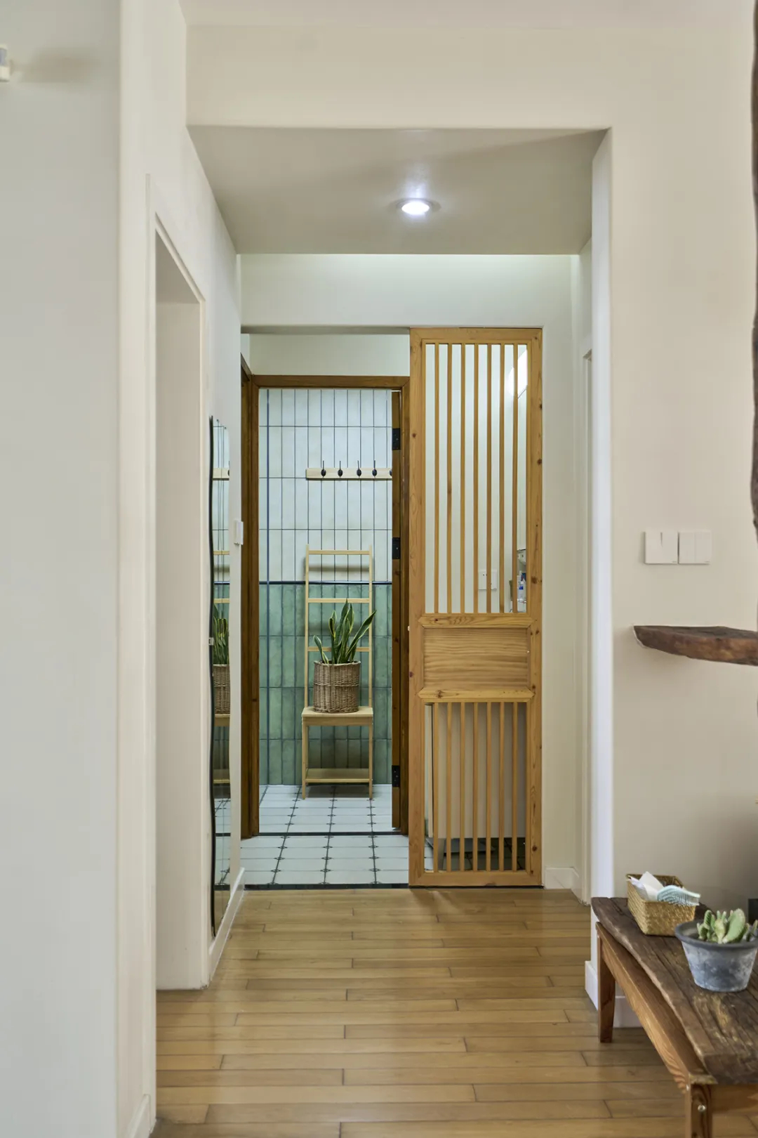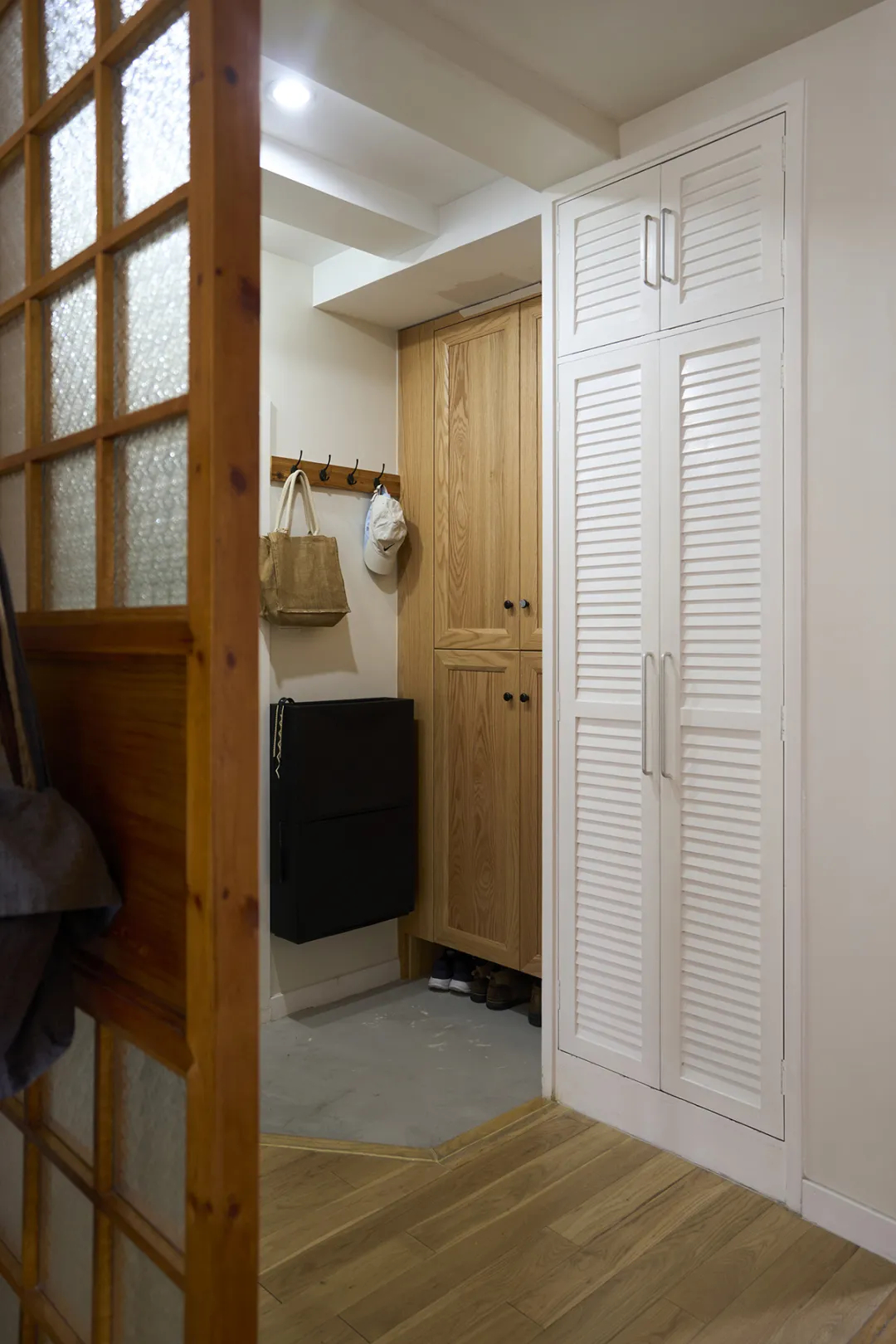 進門玄關處做簡約定制柜,不僅滿足了日常存放鞋子的需求,還在設計上也融入了整體風格,沒有破壞走廊的整體美感。灰色的地磚則與白色墻面形成了對比,增加了空間的立體感。