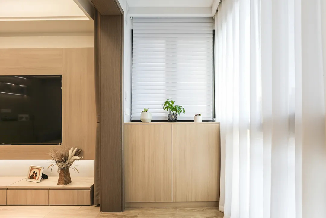 該套房裝修風(fēng)格為原木風(fēng),半透明白色窗簾設(shè)計,讓業(yè)主在寒冷的天氣中有效保溫,保持室內(nèi)的溫馨舒適。定制儲物柜充分利用空間,便于洗衣機(jī)收納、存放大小件物品,為客戶帶來整潔有序、溫暖舒適的家居體驗。