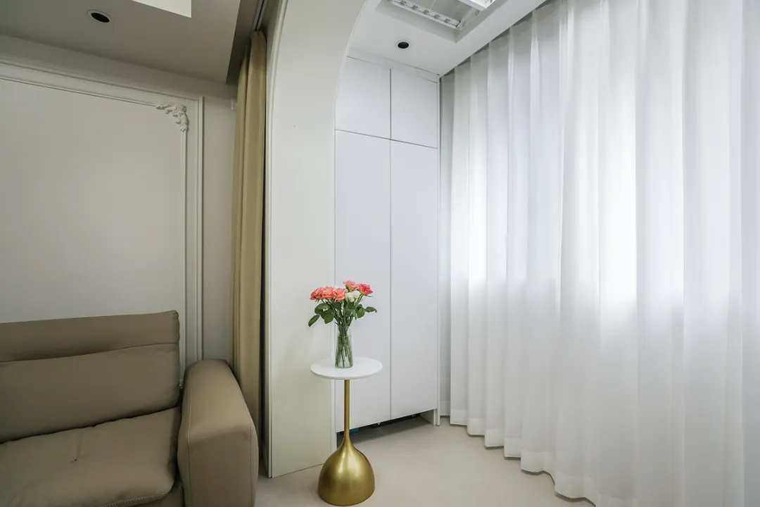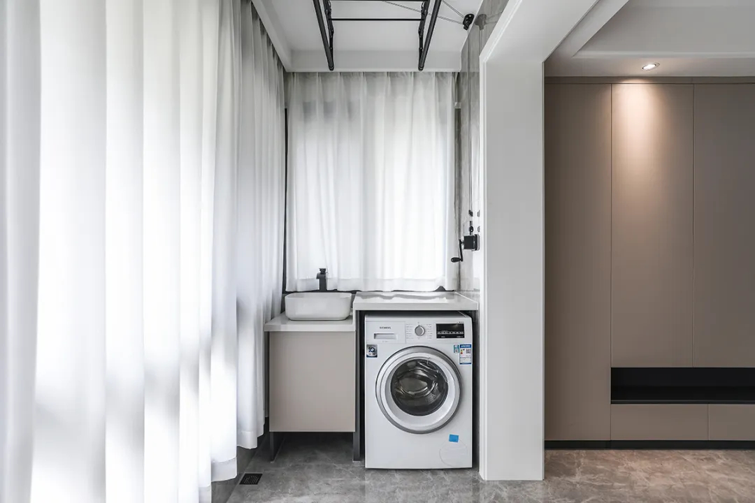 該套房擁有轉(zhuǎn)角陽臺,為此我們打造了可內(nèi)嵌洗衣機(jī)的洗手池,便于清潔小件衣物。另一側(cè)定制通頂儲物柜,提升收納功能。窗簾同樣選擇半透明材質(zhì),確保洗衣房在御寒的同時,也能保持通風(fēng)透氣。
