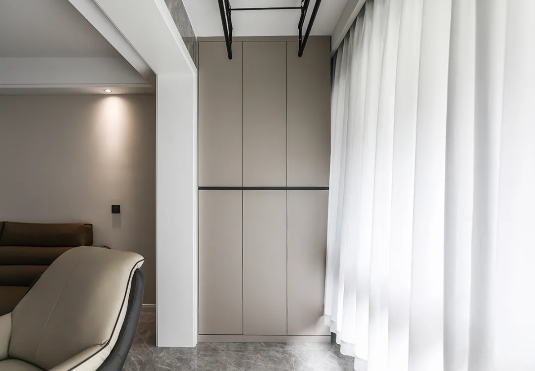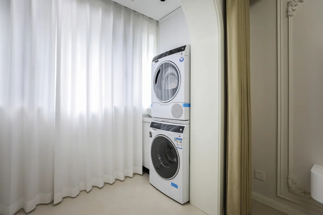該套房裝修為現(xiàn)代奶油風(fēng)格,陽臺區(qū)域米色的墻壁與白色洗衣機(jī)、烘干機(jī)以及窗簾形成和諧統(tǒng)一的整體,營造出清新明亮的空間感。考慮到業(yè)主的收納需求,我們在右側(cè)設(shè)計了通頂櫥柜,用于存放洗滌用品、清潔工具等雜物,使空間得到充分利用。