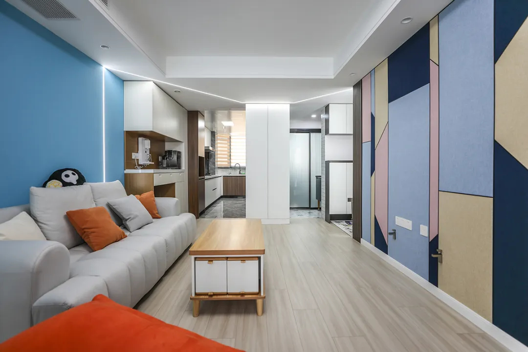 本套房子面積65㎡,平時只有男主一人居住,我們用用幾何抽象色彩打造個性一人居。由于戶型比較完整,南北通透,廚房、衛生間比較寬,所以廚衛之間的隔斷墻做了借位處理,廚房的冰箱借了衛生間空間,衛生間做干濕分離,洗衣烘干機借用廚房空間,同時還做了儲藏柜。整體布局主人閱讀、辦公、健身都有足夠的空間。
