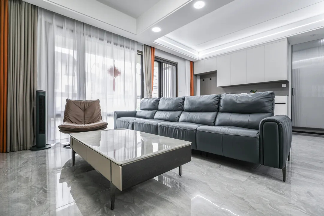 這間客廳的布置,完美展現了都市精英的高雅品味,以現代簡約風為基調,巧妙地融入了時尚與奢華的元素。深棕色沙發與白色茶幾的經典組合,打造出一個既穩重又溫馨的空間。大面積的窗戶設計使得自然光線能夠充分照進室內,為整個客廳帶來了明亮和通透的感覺,無論是商務會談還是休閑放松,都能提供一個更加舒適宜人的環境。
