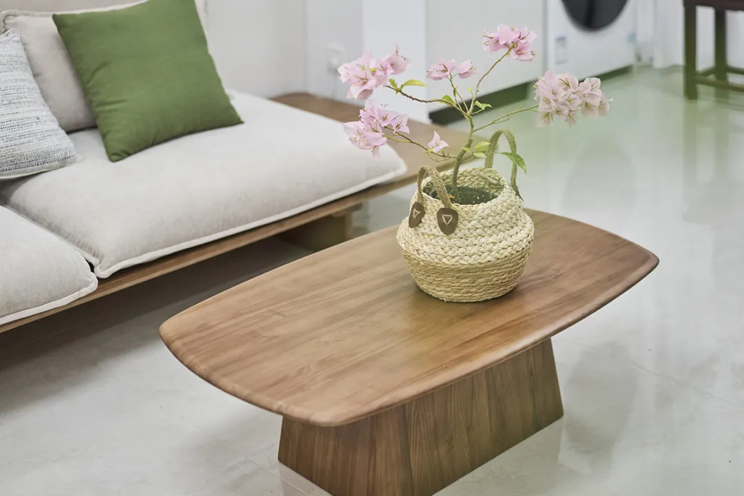 日式原木茶幾造型優美,色澤沉穩而富有質感,凸顯東方獨特的魅力。這張創意茶幾不僅是一件實用的家具,更是業主夫婦審美喜好和實木家具品質追求的集中體現。