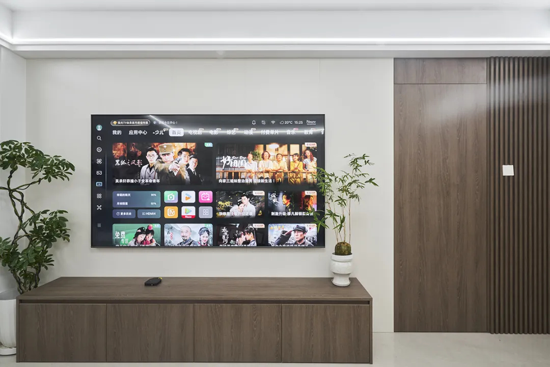 客廳設計亮點之一便是沙發背后的整面墻柜。這面墻柜不僅擁有強大的儲物功能,而且其白色的外觀與整個房間的主色調完美融合,營造出一種簡潔而優雅的氛圍。