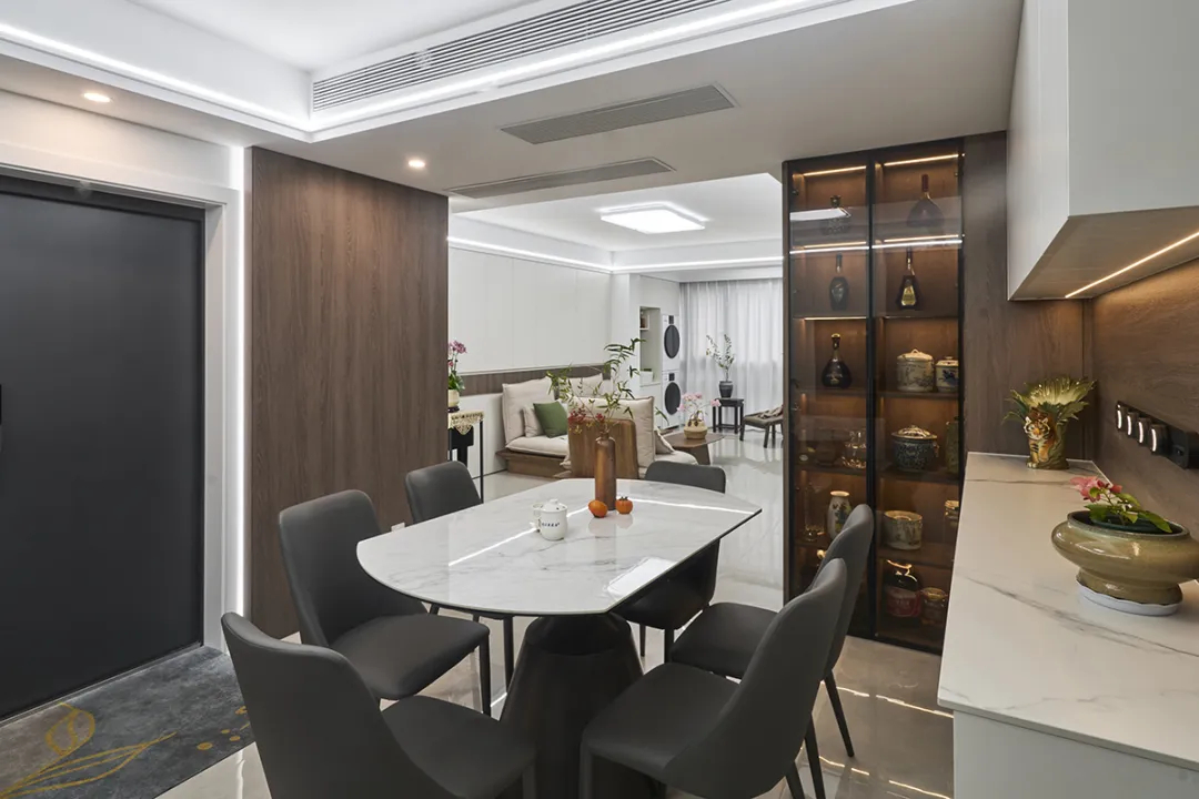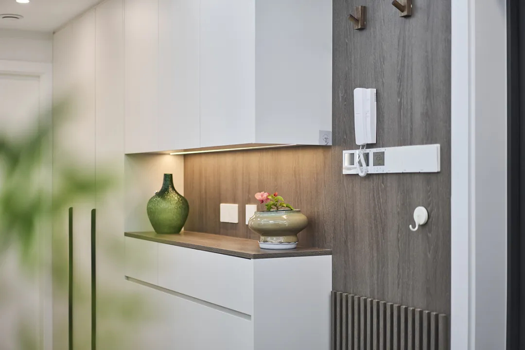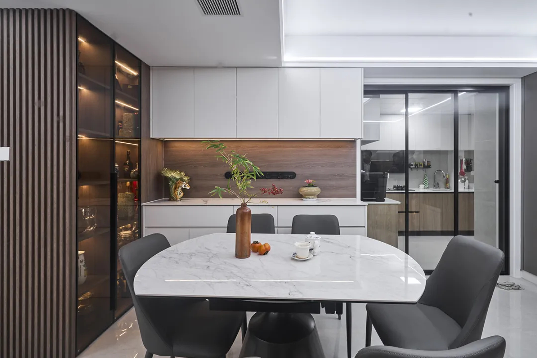 尤為引人注意的是,深色木制酒柜與玄關柜的顏色對比,形成了獨特的視覺美感。玄關柜采用了白色木質材質,與深色玻璃酒柜遙相呼應,共同營造出一種穩重而不失活力的氛圍。