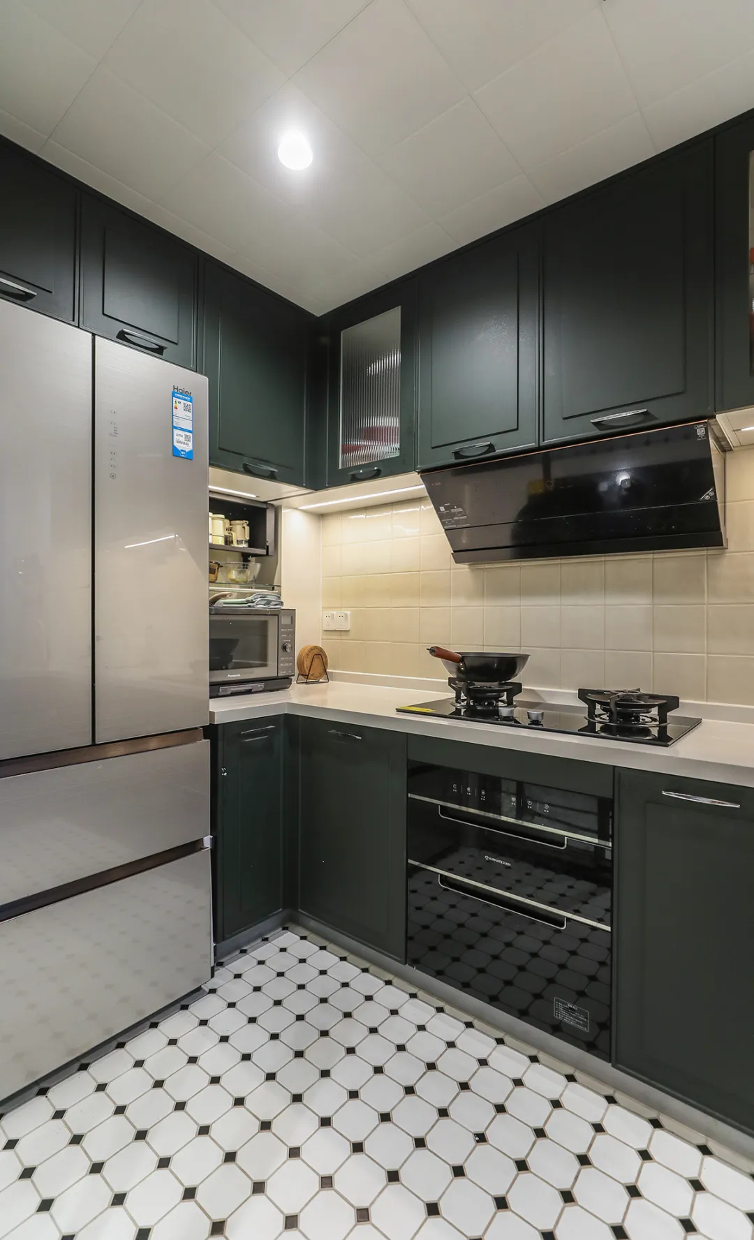 該廚房以深綠為基調(diào),融合黑白經(jīng)典,彰顯高級(jí)質(zhì)感。不銹鋼家電與黑色櫥柜相映成趣,白色瓷磚地面拓寬視覺(jué)空間,各功能區(qū)布局緊湊而有序。黑色臺(tái)面耐臟易潔,水槽設(shè)計(jì)貼心,實(shí)用細(xì)節(jié)滿載,讓烹飪成為享受,小空間也能大作為。