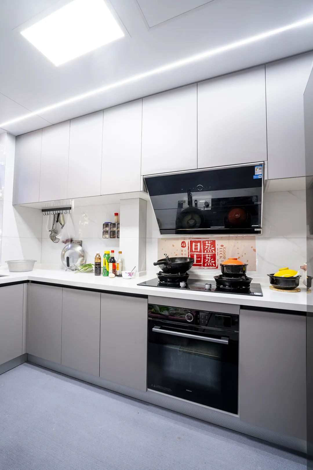 該廚房以白色為主調(diào),搭配灰色與黑色家電,營(yíng)造出清新而高雅的氛圍。各功能區(qū)域設(shè)置,讓收納井然有序。紅色漢字“日月星”點(diǎn)綴的黑色烤箱,成為視覺(jué)焦點(diǎn),彰顯獨(dú)特品味。爐灶面設(shè)計(jì)簡(jiǎn)潔實(shí)用,與整體風(fēng)格相得益彰。整個(gè)廚房功能區(qū)劃分明確,美觀與實(shí)用并存,為客戶帶來(lái)愉悅的烹飪體驗(yàn)。