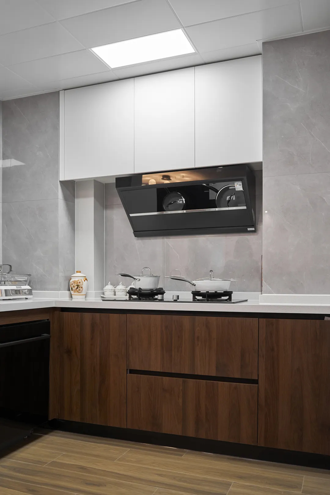 該廚房以白色臺(tái)面為基底,搭配深色木紋櫥柜,簡(jiǎn)約而不失溫馨。黑色烤箱門上的木質(zhì)紋理設(shè)計(jì),為廚房增添一抹自然氣息。燈具的巧妙布局,確保了烹飪時(shí)的充足照明。黑色冰箱與洗碗機(jī)并立兩側(cè),不僅實(shí)用,還彰顯出廚房的整體性。整個(gè)廚房空間布局合理,動(dòng)線流暢,美觀與實(shí)用并重,為客戶提供了高效舒適的烹飪環(huán)境。