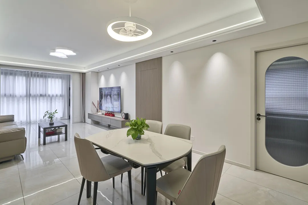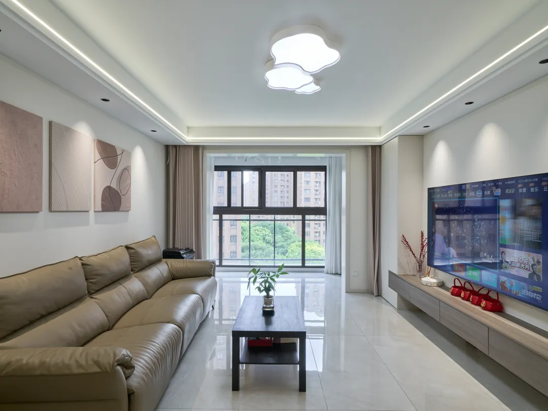 客廳整個空間的設計和色調都給人以現代而時尚的感覺。吊頂設計選擇了流行的雙眼皮造型,與地面的暖灰色地磚相呼應,營造出簡潔、大氣的氛圍。