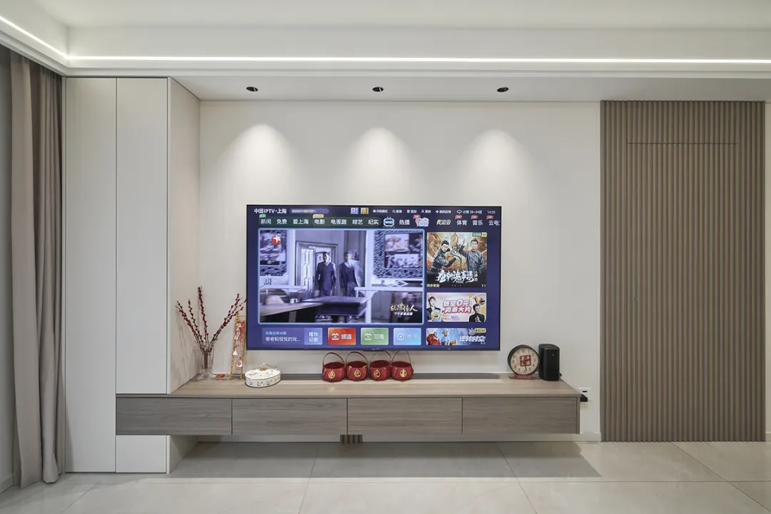 電視墻采用木格柵設計,巧妙地隱藏了主臥的門,既美觀又實用。下方的I型懸空電視柜簡潔現代,與咖色皮質沙發相得益彰,提升了整個空間的檔次。