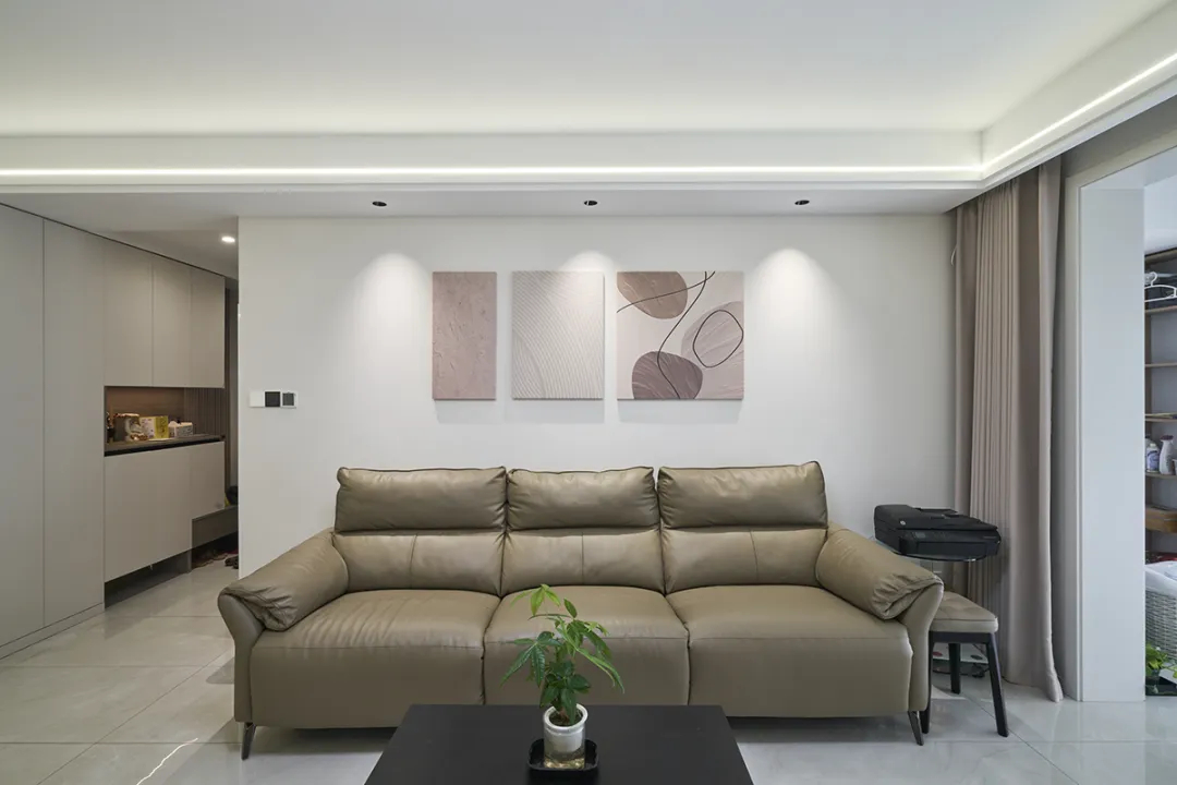 由于客廳設計語言的簡潔實用,所以即便安放了一組貴妃三人沙發,空間依舊顯得寬敞。沙發背景墻上掛著三幅大小各異的掛畫,增添了活潑生動的氛圍。頂部恰到好處地點綴著三盞射燈,使得整個客廳空間顯得更加簡潔和清爽。