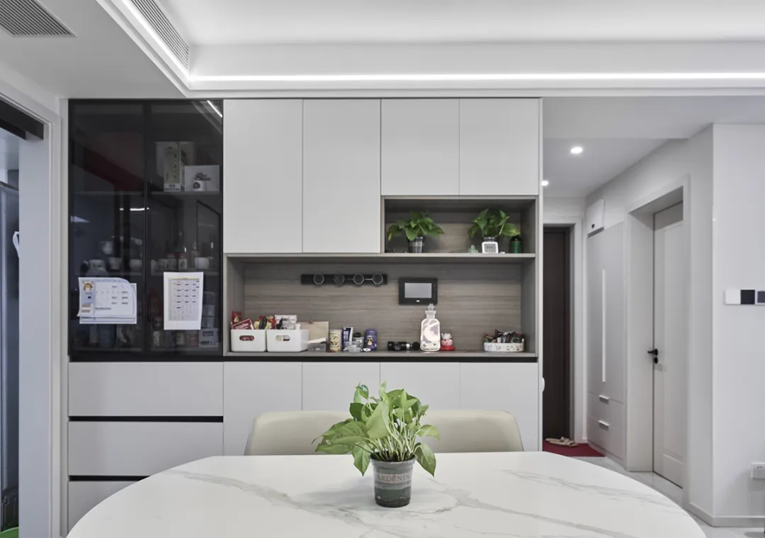 靠墻定制整面墻柜,不僅美觀,而且非常實用。左側玻璃櫥柜可以存放日常餐具、調味料等,防塵又方便取用右側上方做大小不同的收納柜,可以存在日常雜物,中間鏤空做綜合收納柜可以放小件物品或出入用的鑰匙、包包。