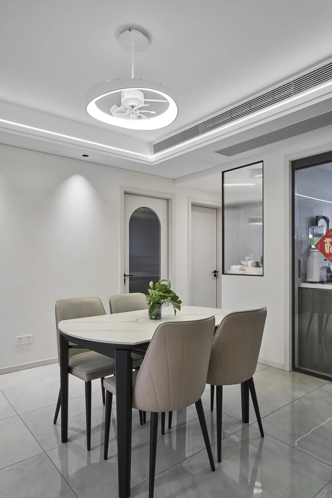 餐廳位于房間中央,以大理石餐桌為核心,搭配四把創意座椅,形成了一個簡約而時尚的用餐區域。既滿足了用餐的實用性,又增添了空間的藝術氛圍。
