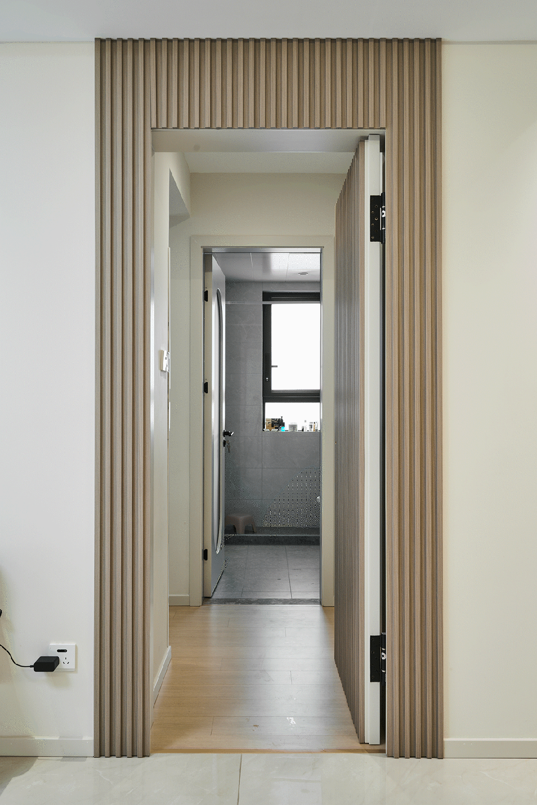 客廳的亮點之一為客廳木格柵墻面作為主臥隱形門,其巧妙的設計不僅增加了空間的美觀性,還巧妙地隱藏了臥室入口,保持了整體空間的連貫性和私密性。
