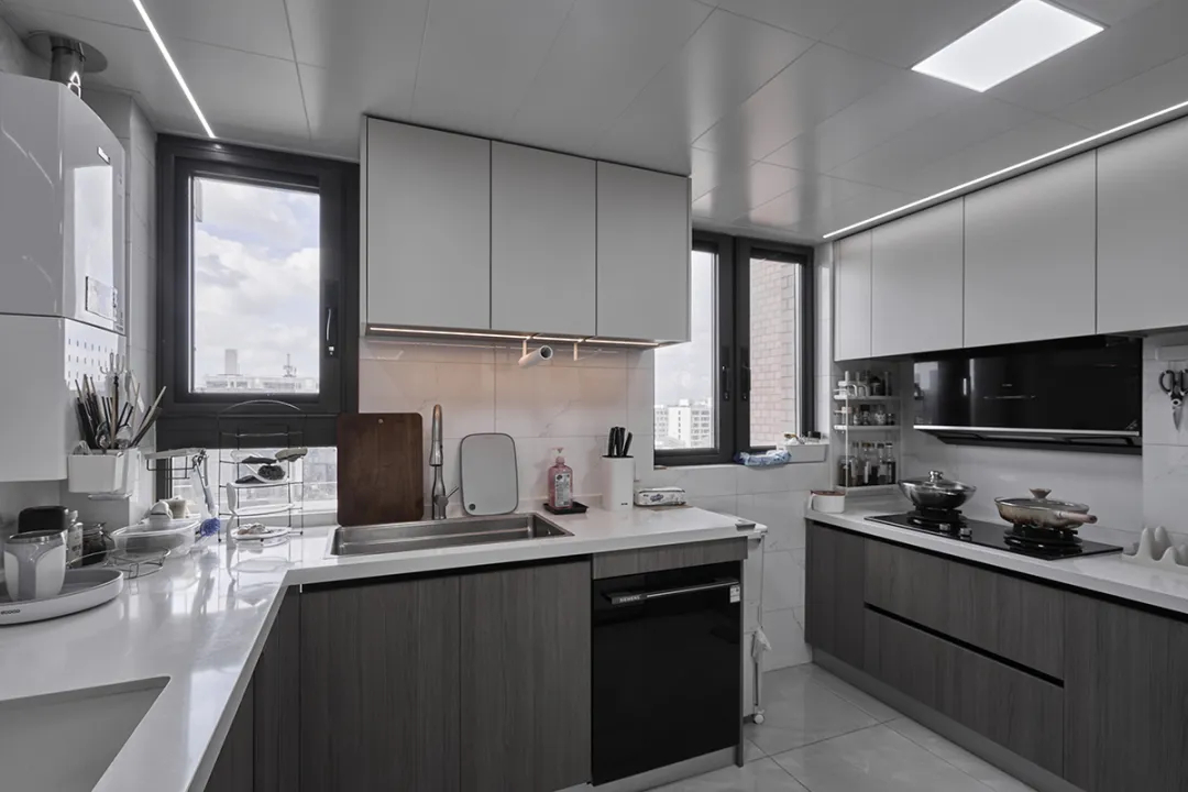 廚房空間很大,而且是不常見的正方形格局,于是我們采用雙L空間格局,最大化廚房空間利用。