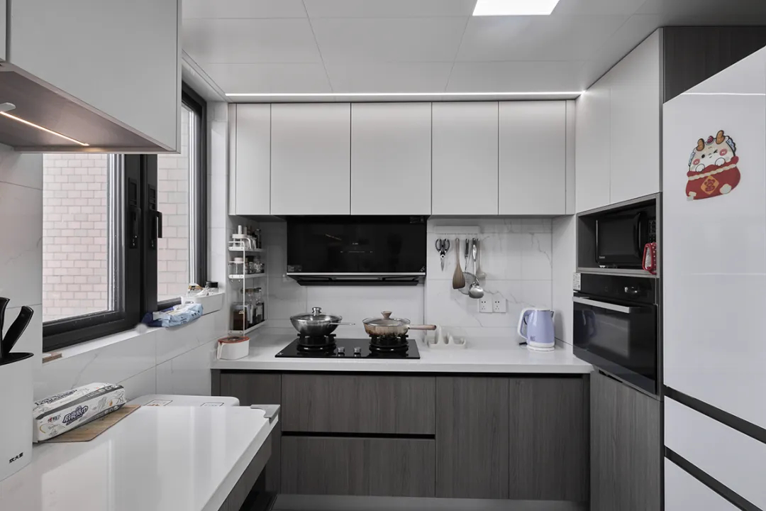 廚房整體以白色和灰色為主色調,營造出明亮且現代的空間感,而木質元素的加入則為廚房增添了一抹溫馨與自然。