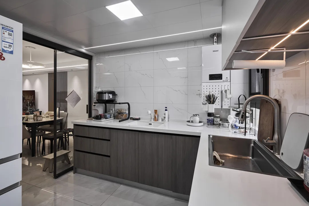 3、廚房采用雙L空間格局,最大化空間利用,木質元素的加入,使得廚房明亮且現代;