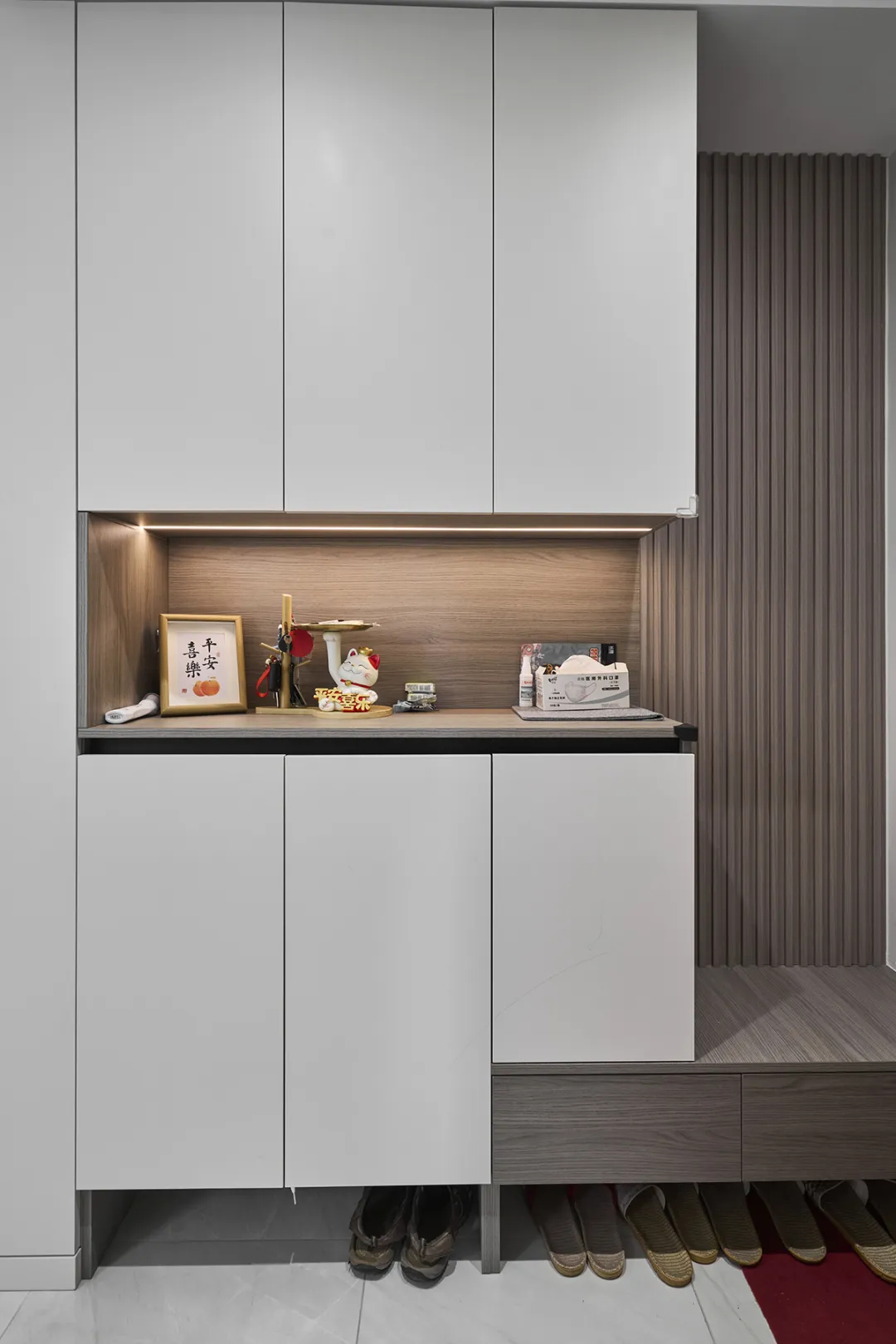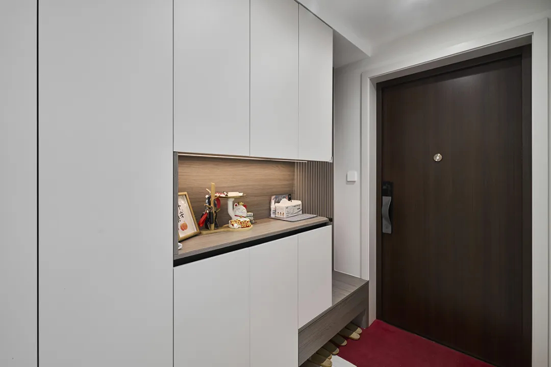 人體工學換鞋凳設計方便業主日常出入時整理儀容。柜子下方鏤空,可以整齊地擺放多雙鞋子,滿足了業主對于鞋履收納的需求。