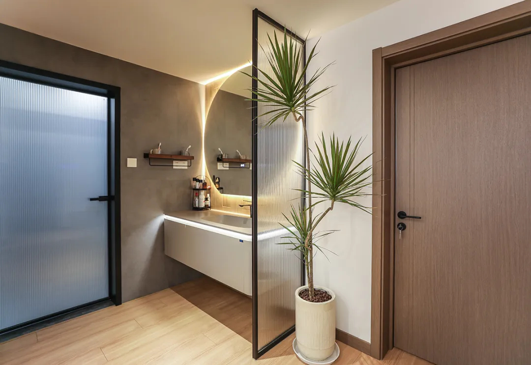 此現代浴室完美融合簡約美學與實用功能,通過干濕分離提升使用效率。玻璃半墻設計不僅界定出干區范圍,更以視覺美感提升整體空間層次感,與LED燈帶相映成趣。白色洗手池與灰色調相得益彰,綠植點綴增添生機。半墻設計實用的同時也為個性化裝飾提供了無限可能,滿足客戶對高顏值與實用性的雙重追求。