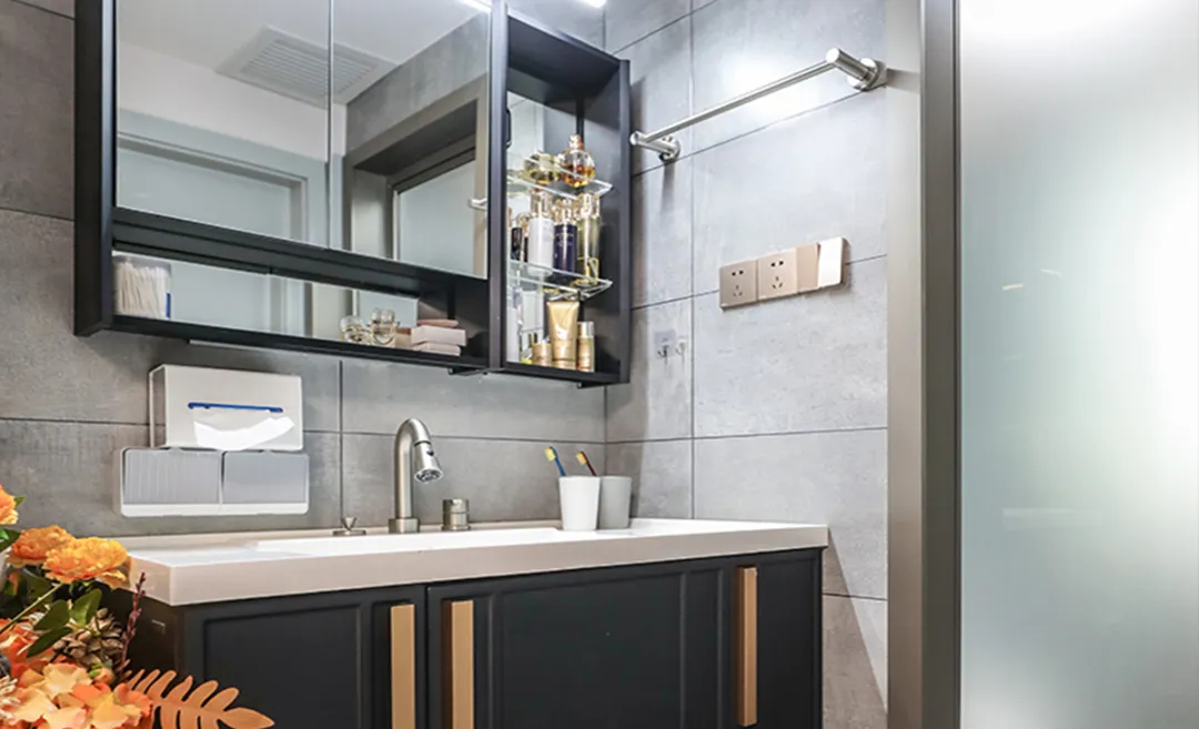 該套房裝修風格以簡約現代為主,灰白配色營造出清爽雅致的氛圍。浴室干區的半墻設計,將有效劃分空間,提升美觀度的同時,也便于日常清潔維護,實現了美觀與實用的完美平衡。黑色柜體的運用在白色基調中形成了鮮明對比,增強了視覺沖擊力,同時提供了充足的儲物空間,便于整理洗漱用品,保持浴室的整潔有序。