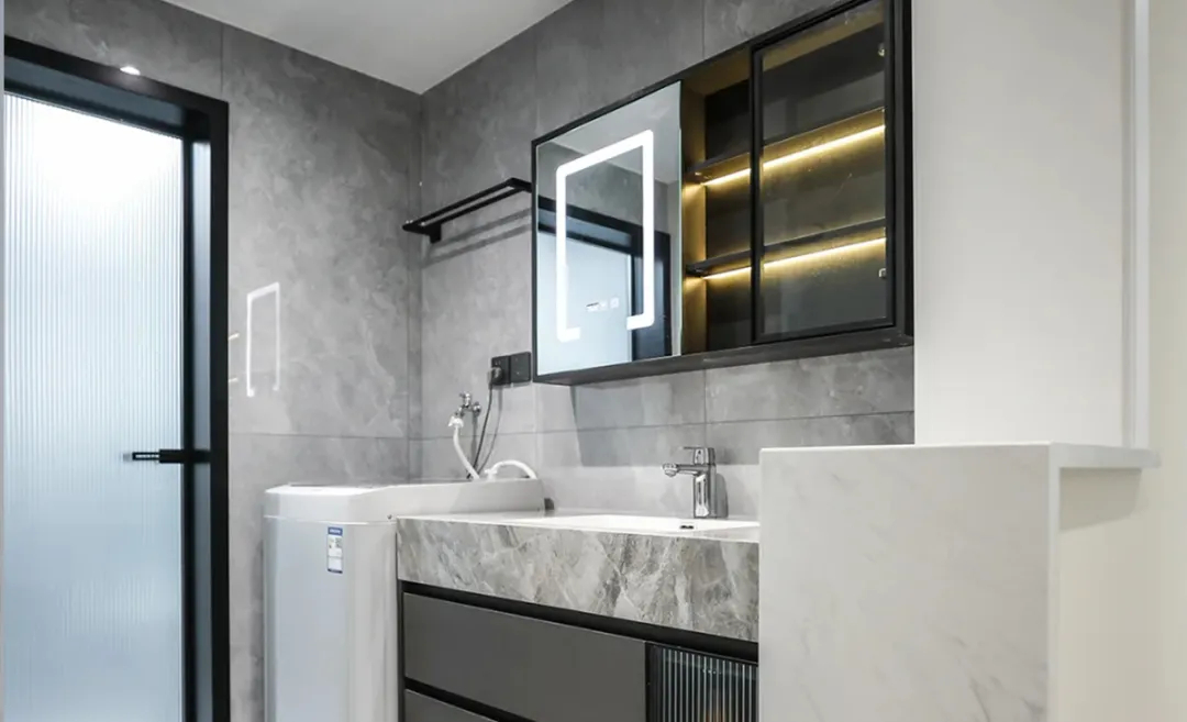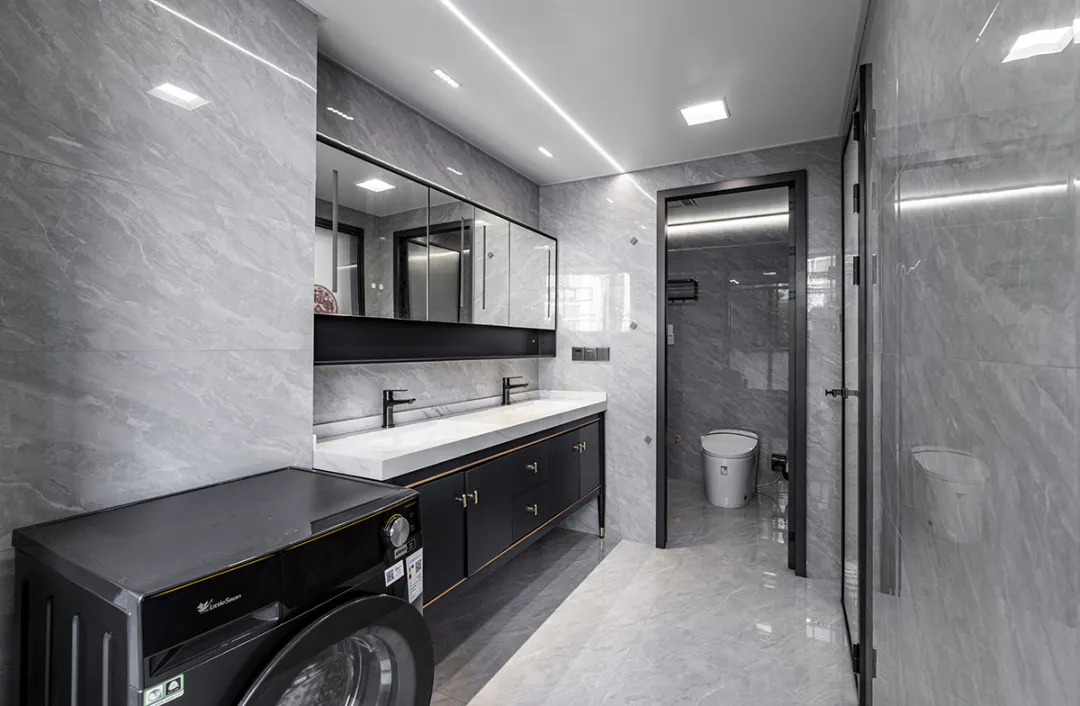該衛生間體現高端與實用的完美結合。灰色大理石瓷磚不僅提升了整體空間的質感,還營造出一種冷靜而優雅的氛圍。黑色洗衣機的融入,不僅滿足了日常洗滌的需求,還以其簡約的設計與整體風格相協調。洗手池區域的設計非常實用,兩個水龍頭方便了多人同時使用,而黑色櫥柜則提供了充足的儲物空間,使洗漱用品井然有序。