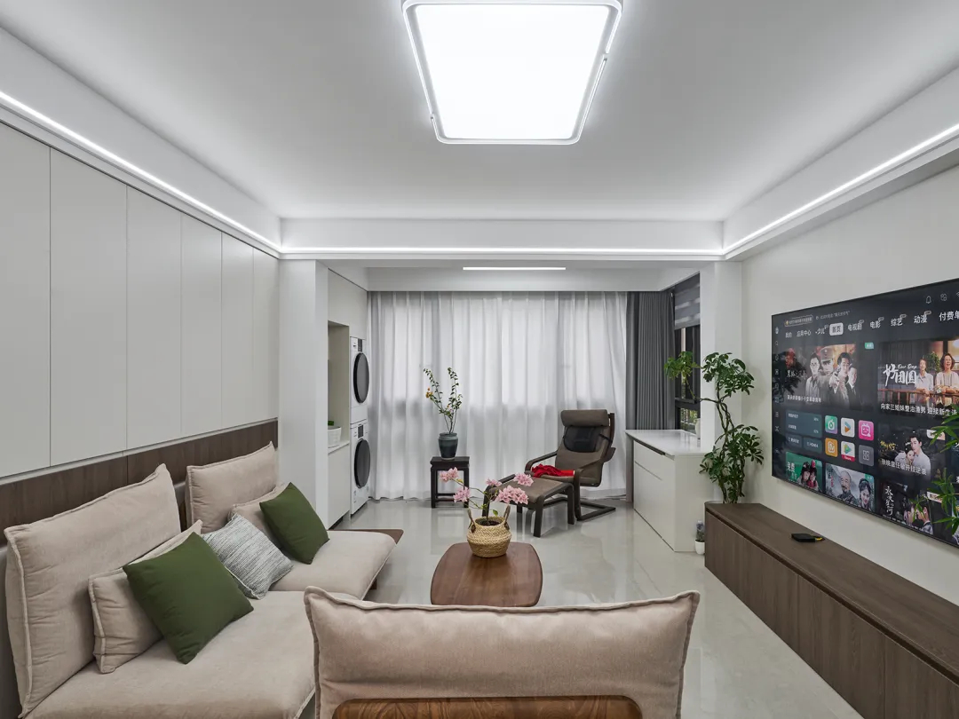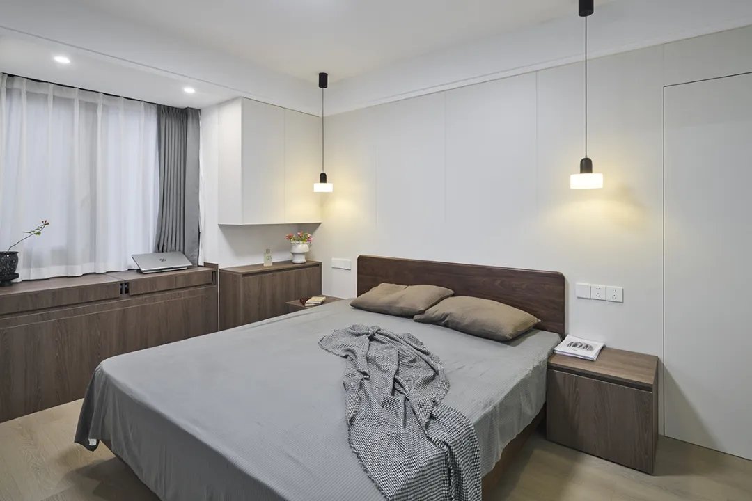 業主夫妻二人從事藝術職業,對裝修有些藝術形式的追求。我們以現代極簡風格為基礎,增加一些原木風格的裝飾,以滿足業主的審美喜好。