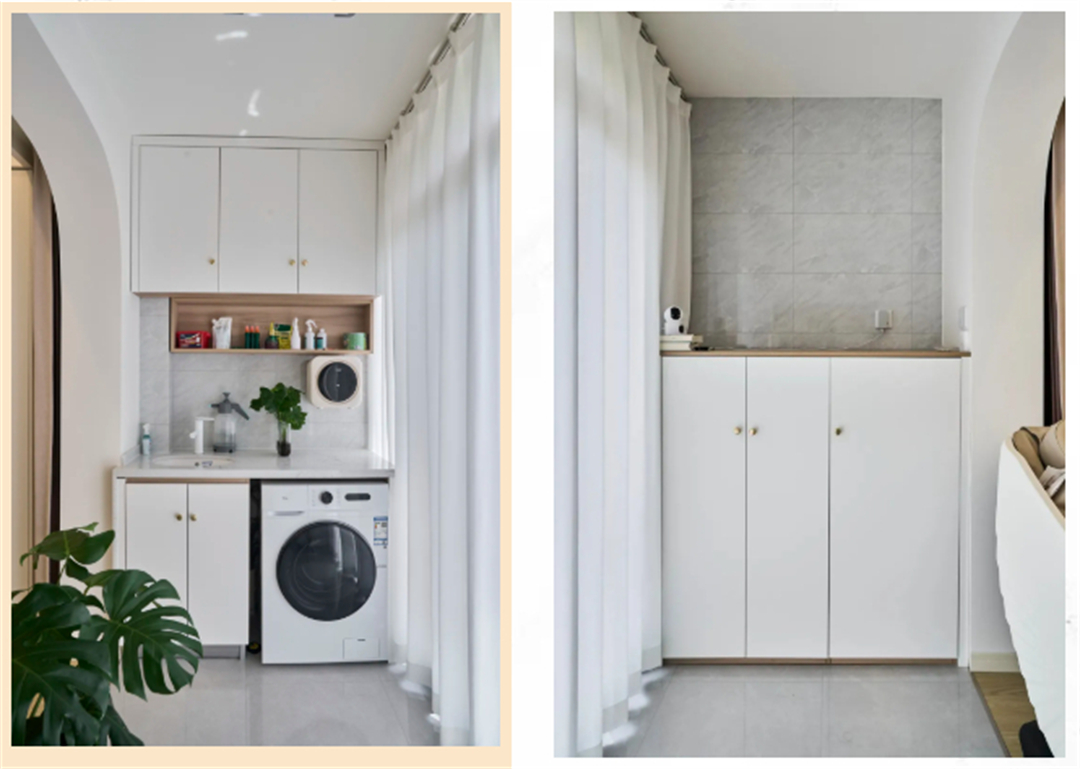 現(xiàn)在多數(shù)人會(huì)把洗衣機(jī)放置在陽(yáng)臺(tái),因?yàn)樯虾6鄶?shù)陽(yáng)臺(tái)為高墻,視野并不開(kāi)闊,所以主要功能為洗衣晾曬。我們可以在定制儲(chǔ)物空間的同時(shí),設(shè)置小水池便于洗滌小件衣物,讓洗衣功能更進(jìn)一步。