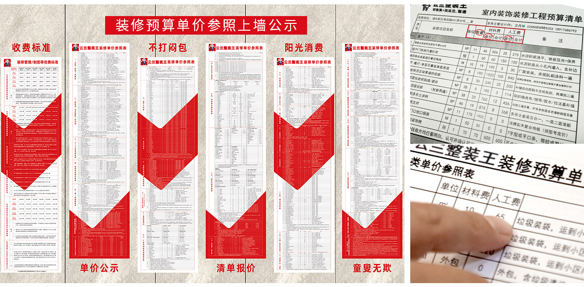 云蘭整裝王堅持清單式整裝預算,即根據一套房子的不同面積、不同的結構、不同的裝修需求,對項目和建材等進行詳細報價。以客廳為例,需要什么樣的風格,天花板有多大,如何處理墻壁,如何改造,使用什么樣的材料。每一項都有詳細的工程量計算,確保前期能100%控制預算。保障給到的套餐報價,就是完工后的裝修總花費。