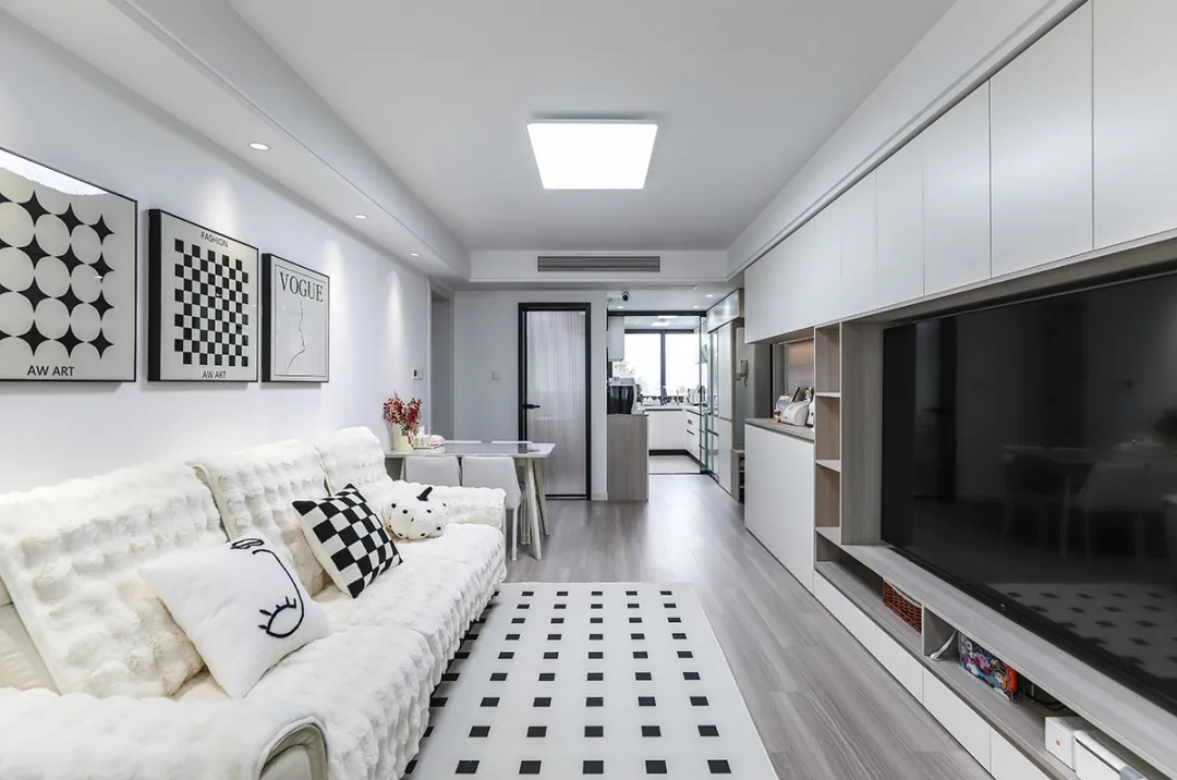 該設計采用現代簡約之爆火奶油風,奶油色作為整體的主色調,被運用在墻面和天花板上,搭配淺木色地板,營造出一種溫馨舒適的氛圍。白色布藝沙發與白灰色電視柜相互呼應,簡約而不失質感。我們還巧妙地融入了一些棋盤格元素,打造出一個既溫暖又充滿時尚感的休閑空間。