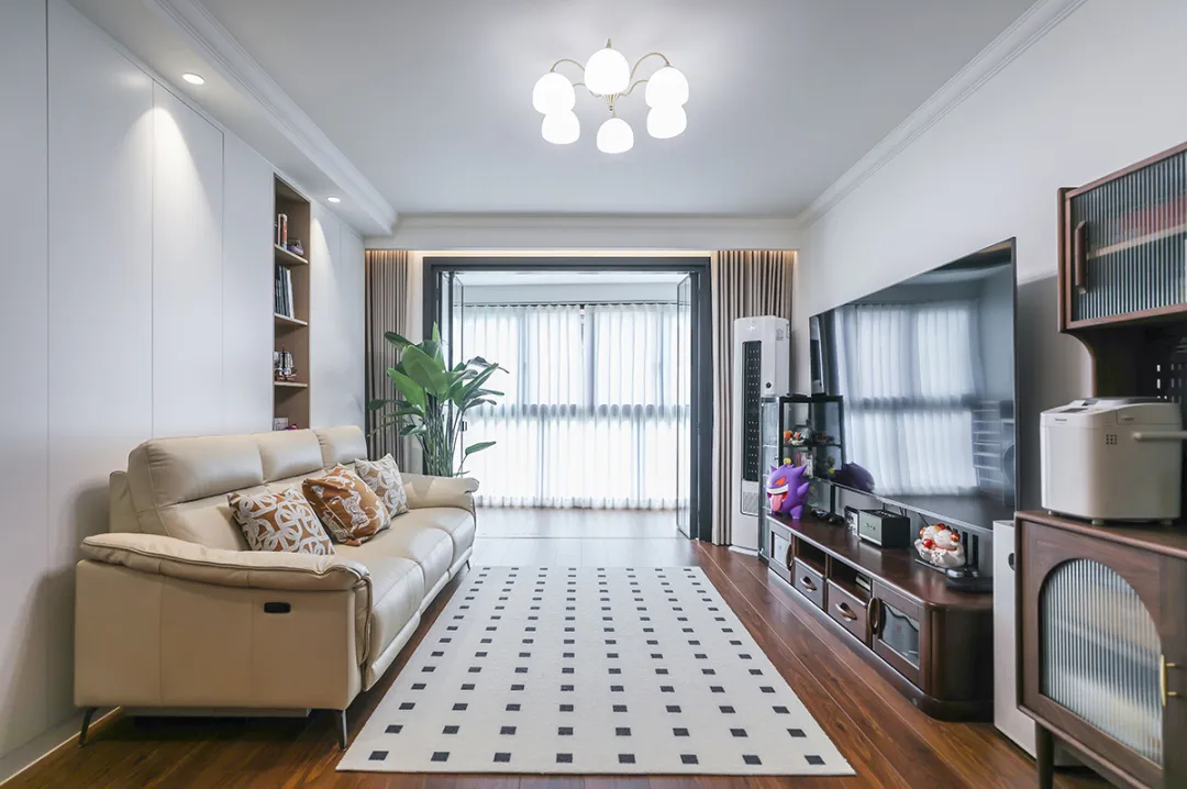 1、客廳巧妙地利用過道空間,改造為寬敞的客廳,并定制多功能墻柜,既個性又彰顯品味;