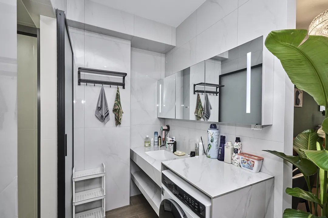 家里只有一個衛生間,早上容易排隊上廁所。如果做了浴柜外置,把洗漱臺挪到外面,不僅能避免這個問題,還能讓衛生間更整潔。