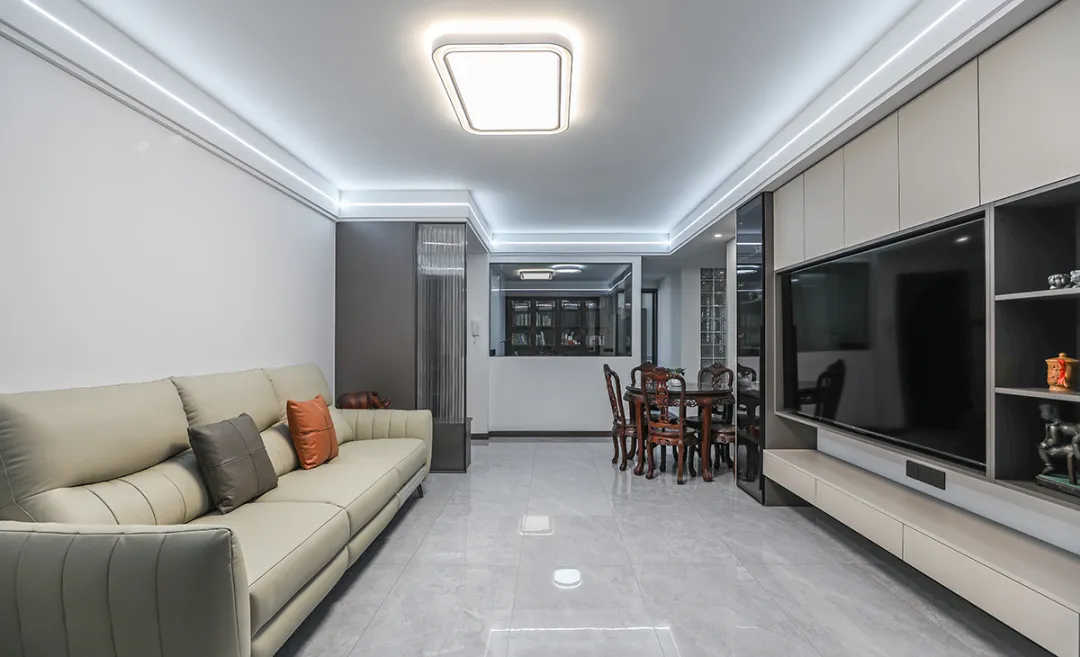 普陀區鎮坪路176弄:該客廳以白色與灰色的主色調,營造出簡約而不失高雅的商務氛圍。長形沙發與圓形咖啡桌的搭配,既滿足了商務洽談的實用性,又不失時尚感。嵌入式電視柜與深色儲物柜的設計,不僅節省空間,還展現出主人的細致品味與高效生活態度。