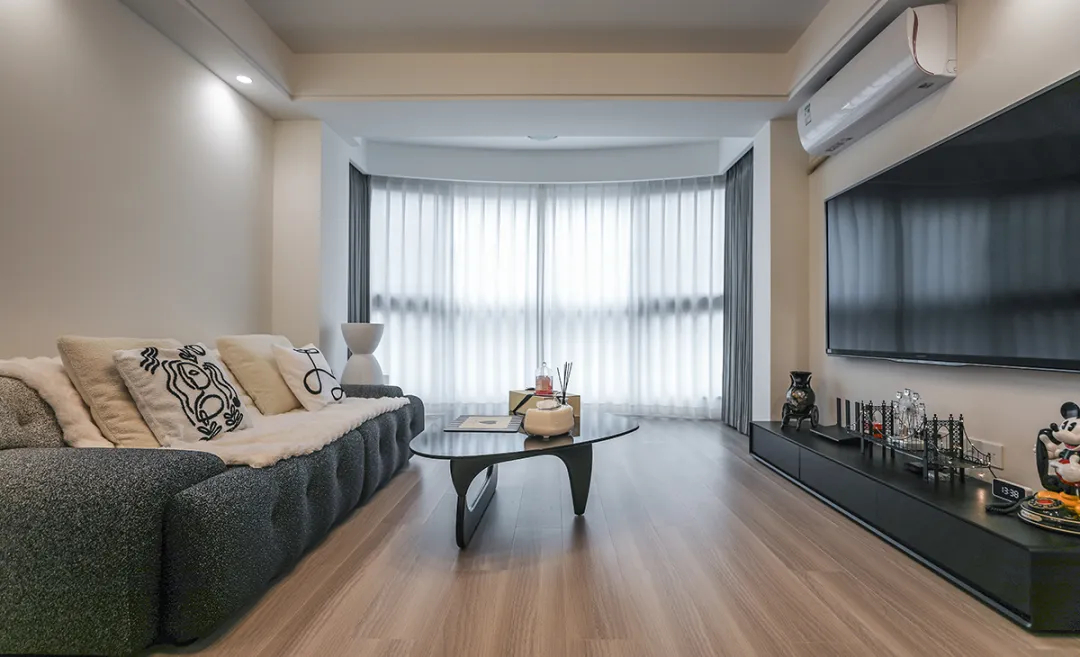 楊浦區黃興路1717弄:該客廳以簡約而不失奢華的線條勾勒空間。灰色與白色的抱枕搭配長形沙發,展現出低調的商務風范。圓形玻璃茶幾與黑色電視柜的組合,不僅實用且充滿設計感,彰顯出主人的獨特品味。大窗戶引入自然光線,讓空間更加明亮通透。
