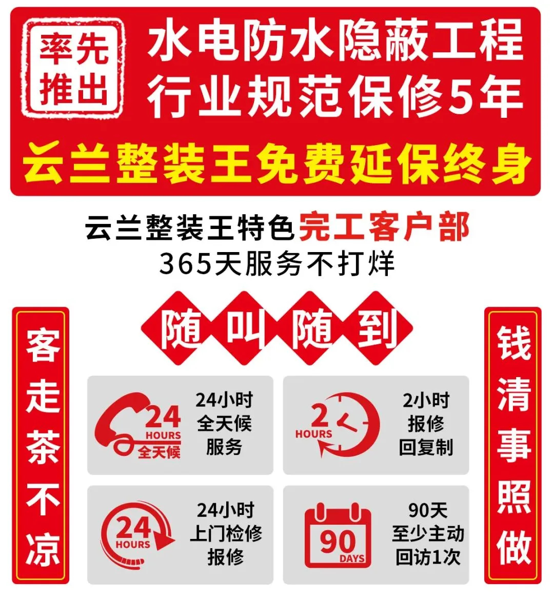 為了更好地服務(wù)客戶,云蘭整裝王率先推出:水電隱蔽施工工程行業(yè)規(guī)范保修5年,云蘭整裝王免費(fèi)延保終身。這意味著無論時(shí)間過去多久,只要裝修客戶遇到與隱蔽工程相關(guān)的問題,云蘭整裝王都將負(fù)責(zé)到底。這一承諾徹底解決了客戶的后顧之憂,讓業(yè)主在裝修過程中更加放心。