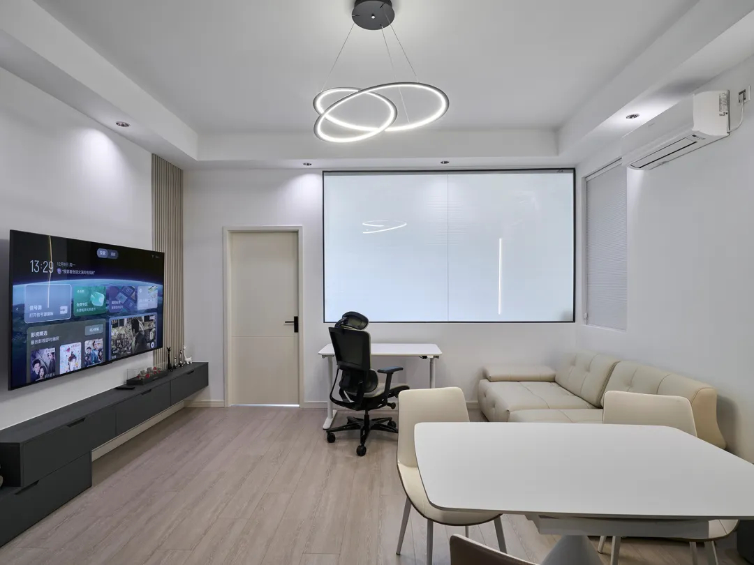 在大落地窗前安置了一個升降電腦桌,完美地滿足了主人的辦公和游戲需求。無論是處理工作事務(wù)還是享受游戲時光,都能在這里找到屬于自己的舒適空間。