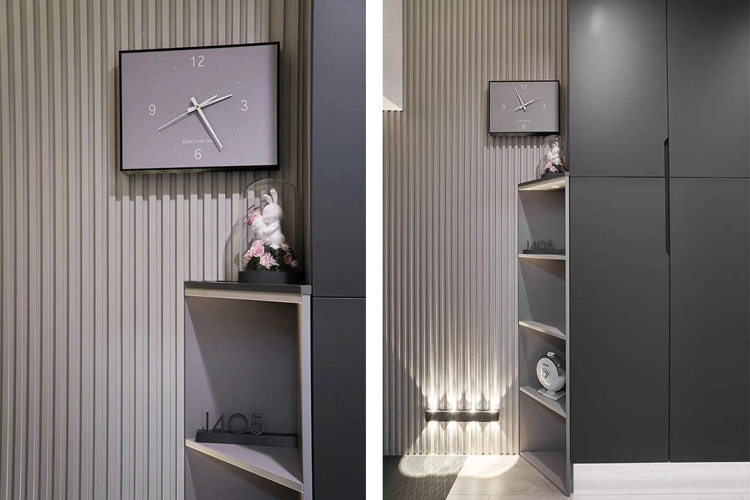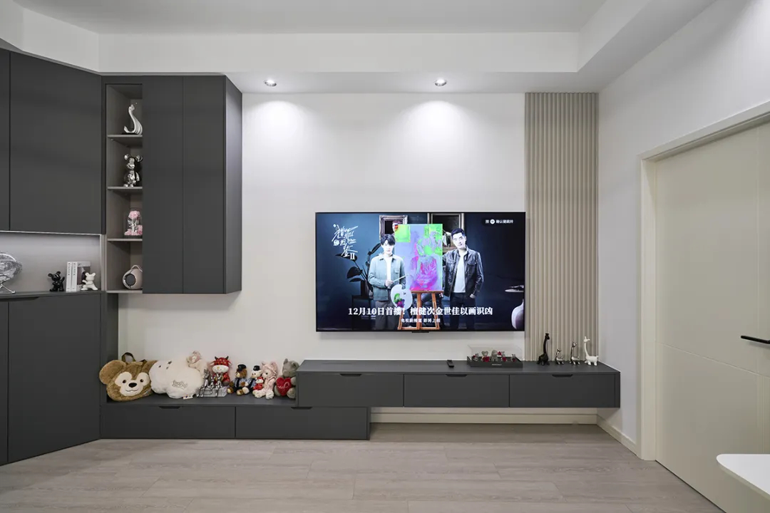整體灰色的電視柜從玄關(guān)延伸至電視背景墻區(qū)域,形成了一種連貫的視覺效果。奶咖色的木格柵巧妙地融入其中,起到了畫龍點(diǎn)睛的作用。干凈簡潔的背景墻搭配70寸的大電視,讓人即使長時間待在客廳也不會感到乏味。