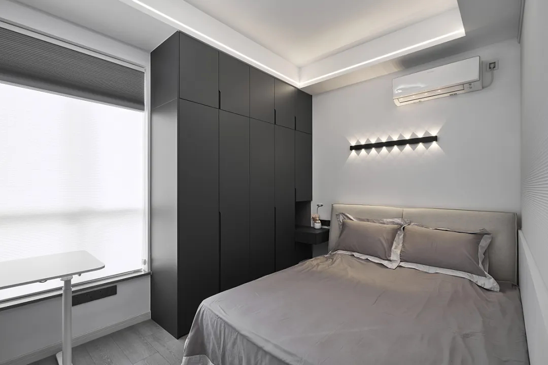 2、衣柜與床頭柜一體化設(shè)計,巧妙利用空間,增添空間趣味性;