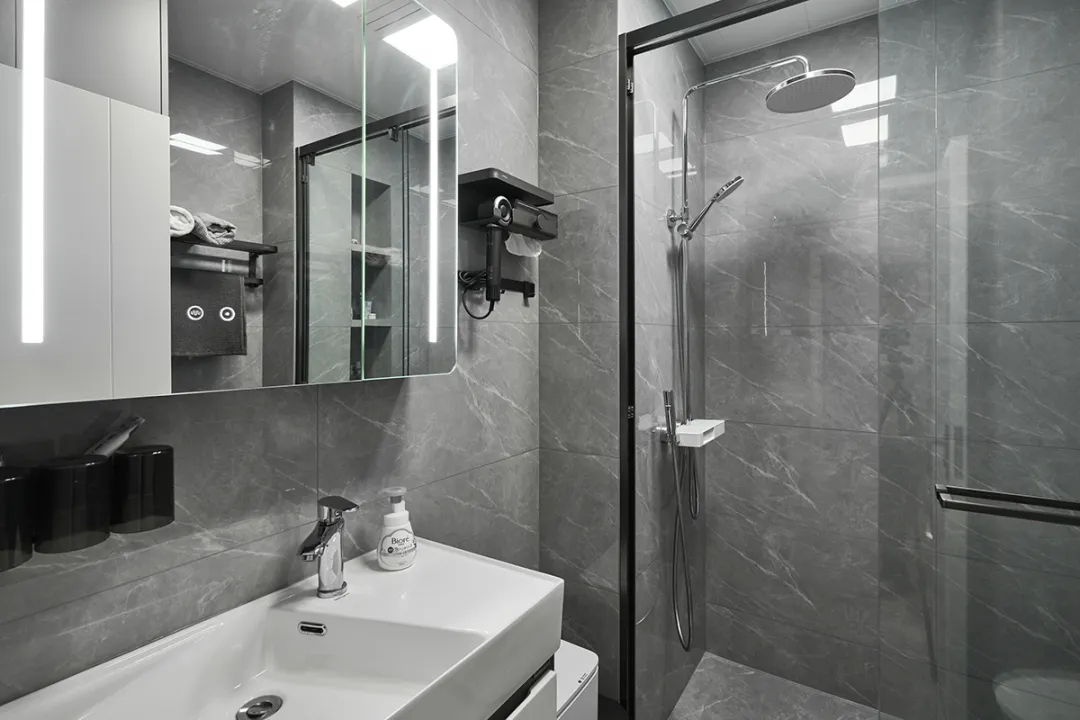 衛(wèi)生間采用了干濕分離的設(shè)計,能夠滿足兩人同時使用,提高了生活的便利性。壁龕的巧妙設(shè)計節(jié)省了原本不大的淋浴區(qū)域,使得空間利用最大化,讓衛(wèi)生間看起來更加整潔有序。