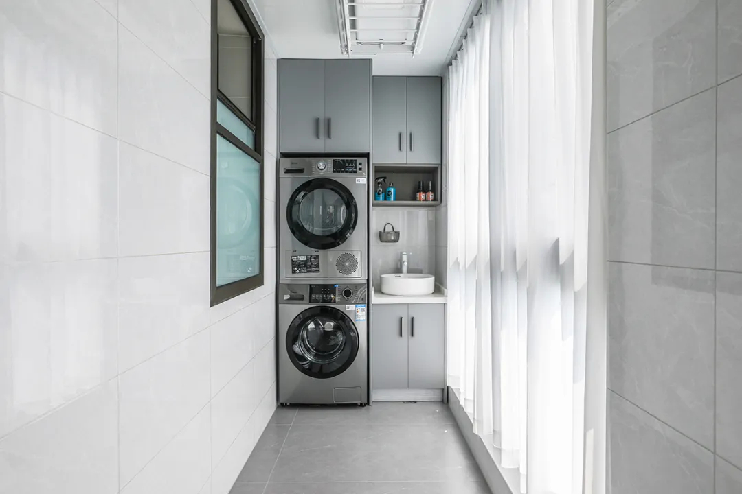 如果陽臺(tái)夠大,分出一小塊做獨(dú)立洗衣間,洗衣晾衣互不干擾。陽臺(tái)剩下的空間就能用來休閑、種花,享受愜意時(shí)光。