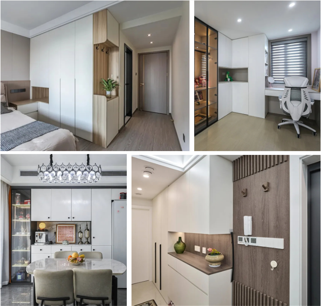 臥室重點考慮衣柜收納和睡眠舒適度,客廳突出電視柜和展示柜。家里有老人小孩,柜子邊角做圓潤處理,避免磕碰。