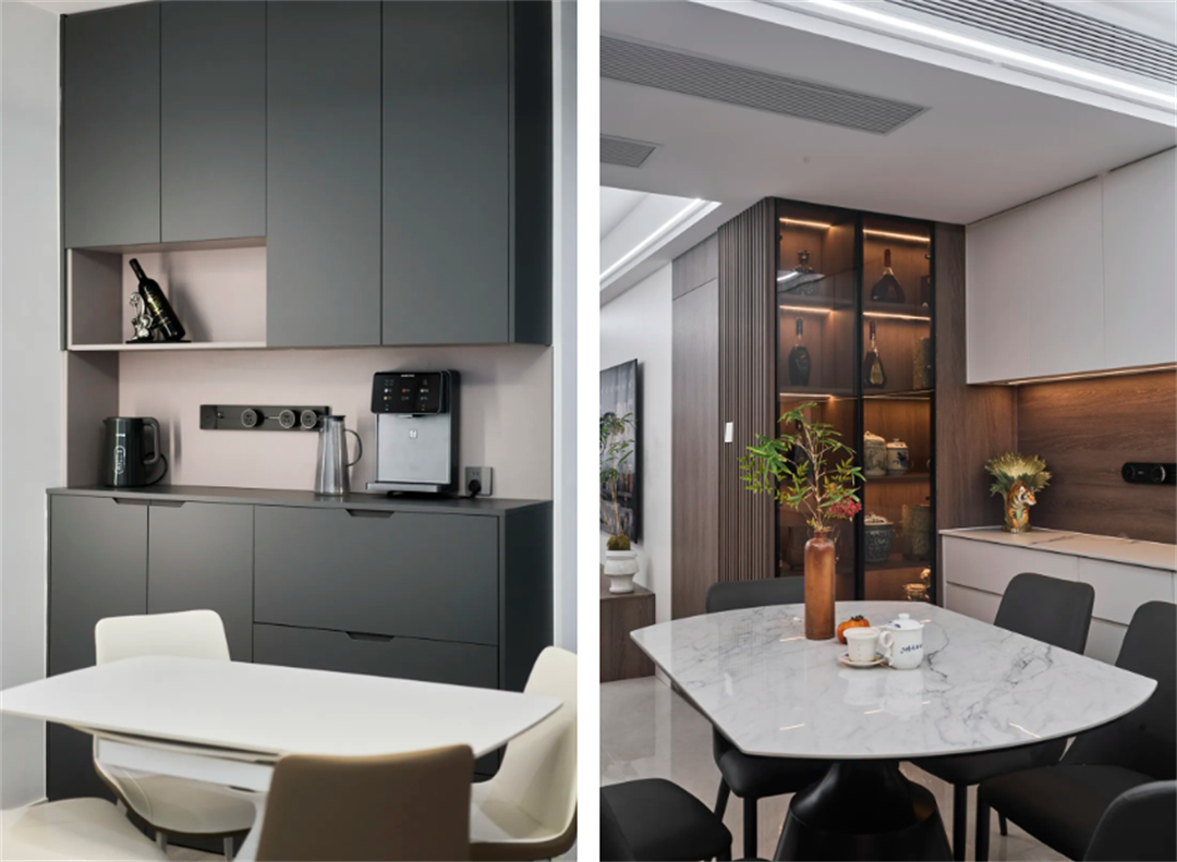 餐廳區域的定制柜體可以提供額外的儲物空間,同時作為裝飾元素,提升餐廳的整體美感。我們為這兩套房的餐廳設計了大理石餐桌和配套的餐椅,旁邊定制了餐邊柜和酒柜,不僅提供了展示和收納酒類的空間,還增加了餐廳的裝飾性。