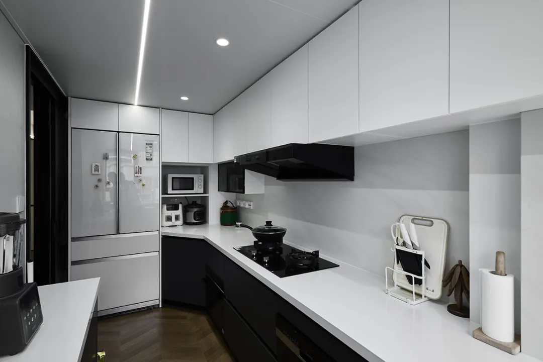 廚房區域的定制柜體可以根據不同家庭的烹飪習慣和廚房布局,提供個性化的儲物解決方案,使廚房操作更加高效。我們為該廚房設計了L型櫥柜,結合了吊柜和地柜,提供了大量的儲物空間。同時,我們還在櫥柜中嵌入了電器,如烤箱、冰箱等,使廚房更加整潔和現代化。