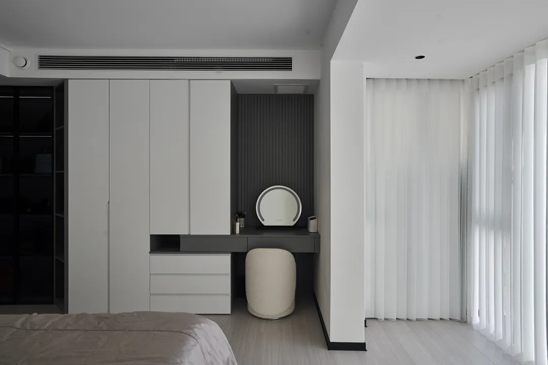 臥室區域的定制柜體可以提供充足的衣物和個人物品的收納空間,同時保持臥室的整潔和舒適。我們為該臥室設計了嵌入式衣柜和梳妝臺,提供了大量的衣物收納空間,同時梳妝臺的設計也方便了日常的化妝和整理。