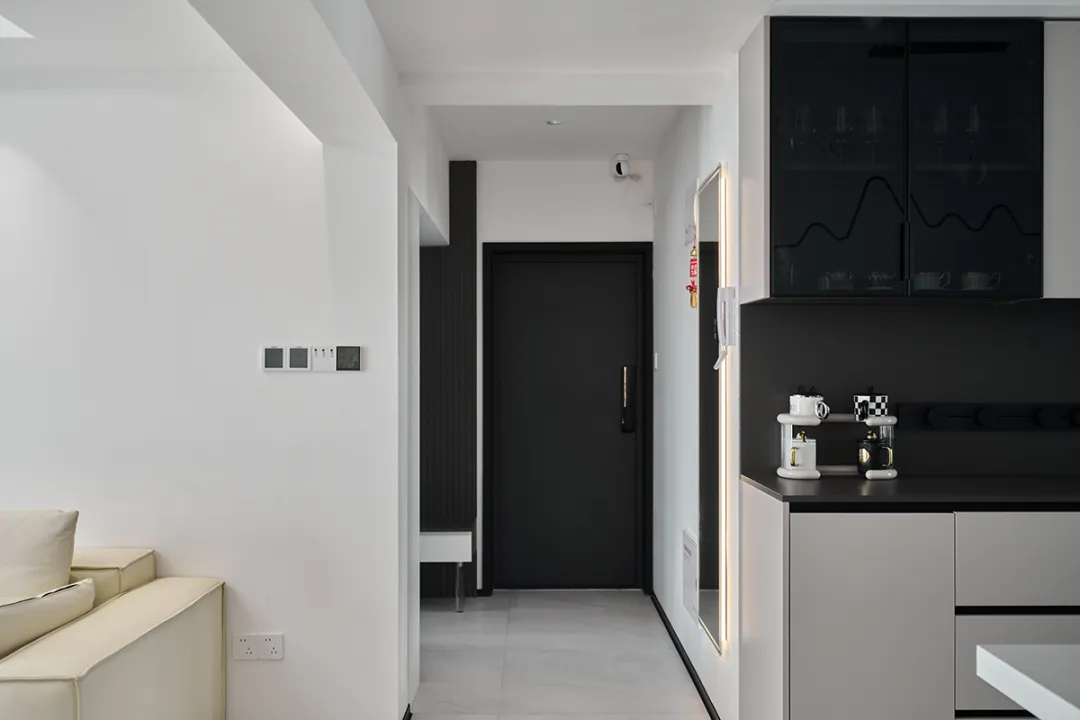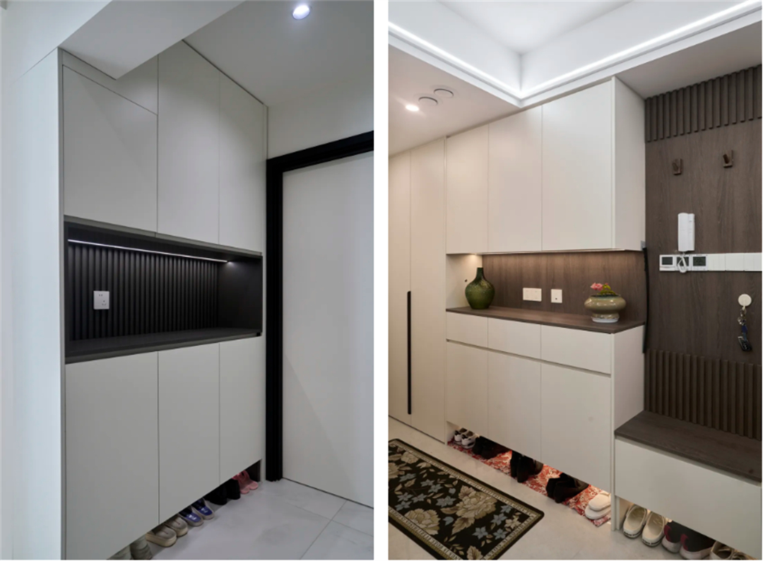 玄關區域的定制柜體可以提供鞋子和日常用品的收納空間,同時作為進入家門的第一印象,提升整體的美觀度。我們為這兩套房的玄關設計了一體鞋柜和儲物柜,提供了充足的鞋子和日常用品的收納空間。同時,鞋柜下方的開放式架子方便放置常穿的鞋子,保持了玄關的整潔。