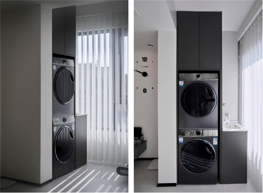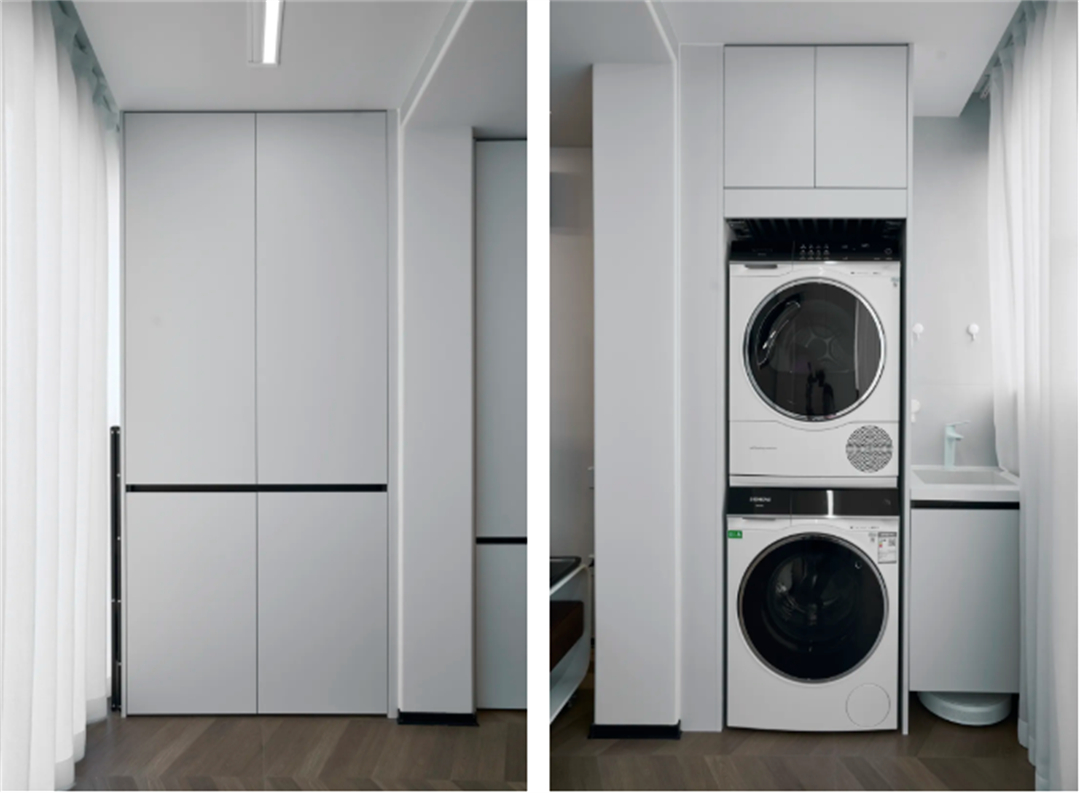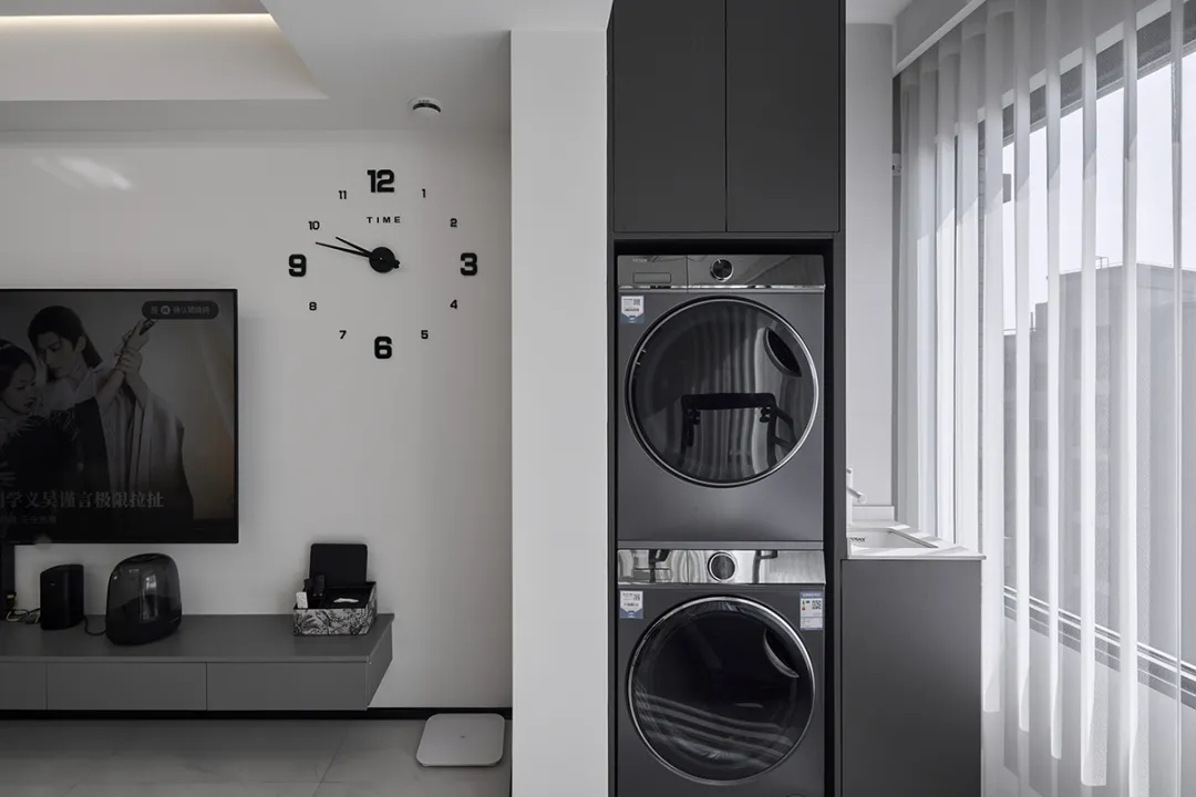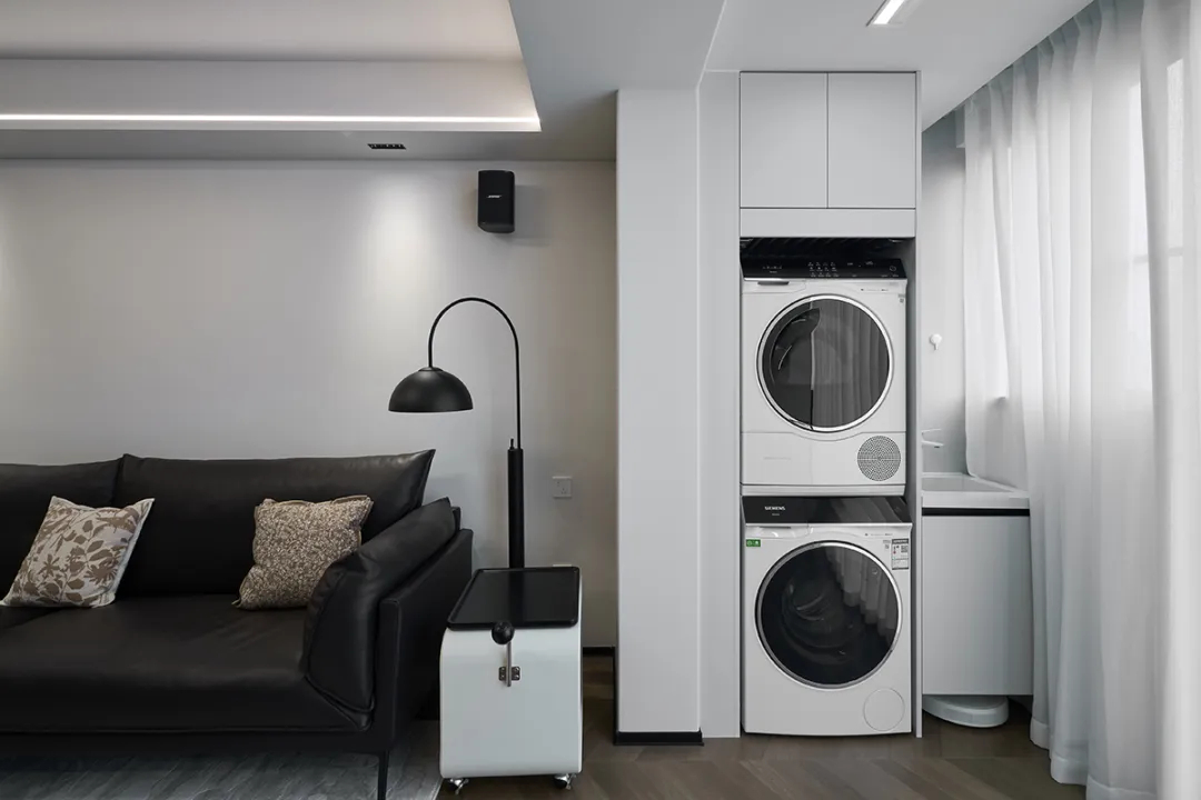靖宇東路55弄:這套房裝修采用簡約風格,色調以白色和灰色為主,營造出明亮、整潔的空間感。洗衣機和烘干機被巧妙地安置在陽臺一側,上方的儲物柜提供了額外的收納空間。這樣的設計不僅提高了空間利用率,還讓陽臺成為一個多功能的生活區域,為客戶提供了實用且舒適的居住體驗。