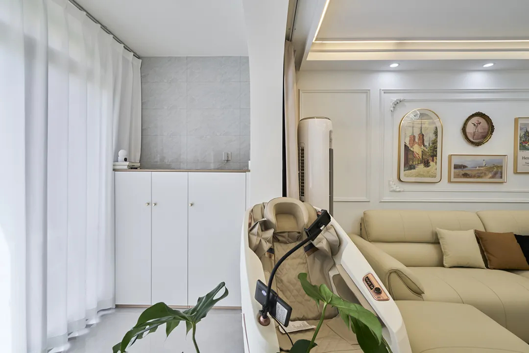 吳楊東路333弄:這套房的陽臺經過我們精心設計,實現了多功能一體化。我們設置了嵌入式洗衣機和烘干機,上方和旁邊配有儲物柜,提供了充足的收納空間。另一側則設計了休閑區域,擺放了按摩椅和綠植,增加了舒適感和自然氣息。這樣的裝修細節不僅提升了空間利用率,還增強了生活的便利性和舒適度,為客戶提供了一個既實用又美觀的陽臺空間。