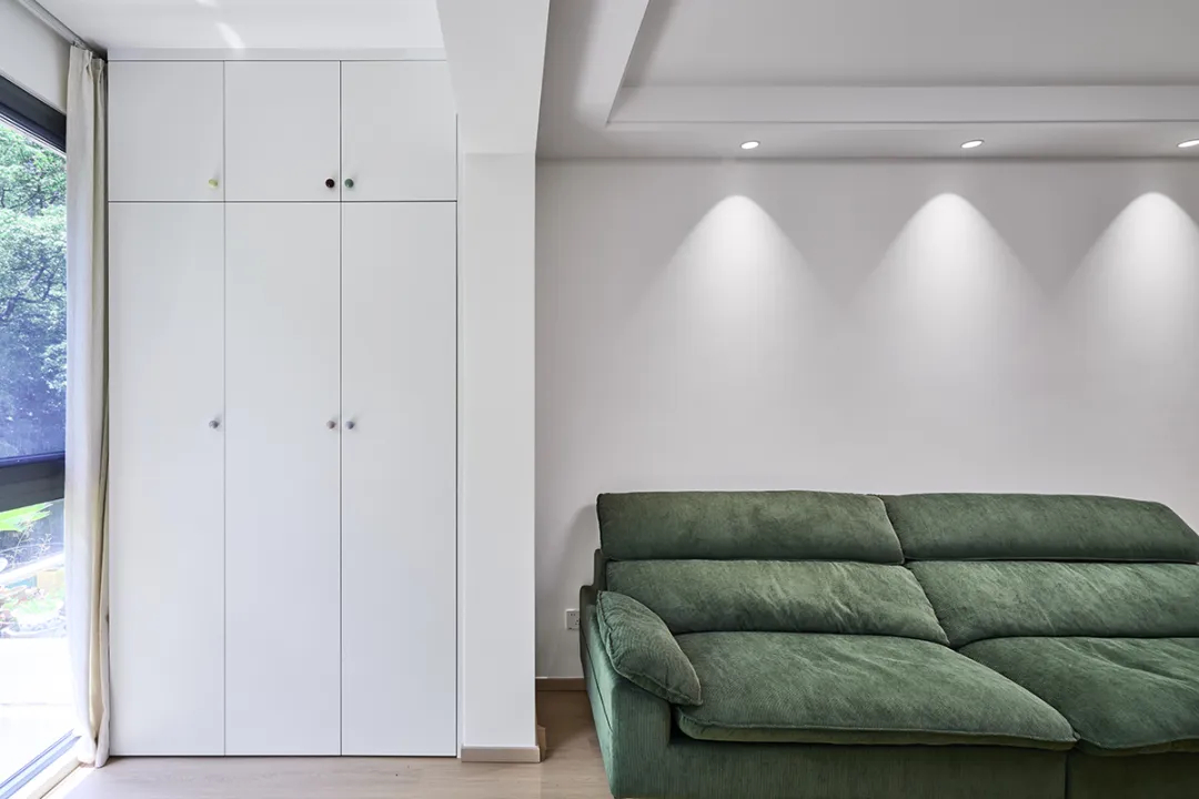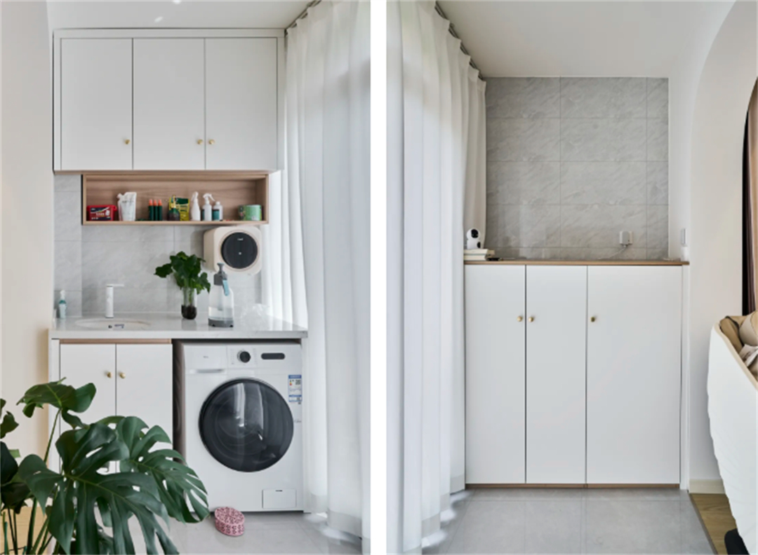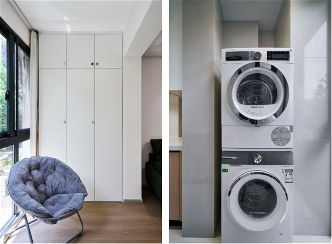順義路100弄:這套房的陽臺裝修以實用和美觀并重,實現了收納、晾曬和觀光的多功能融合。陽臺一側配置了上下疊放的洗衣機和烘干機,優化了空間使用,方便日常衣物洗護。另一側則設計了白色儲物柜,提供了充足的收納空間,保持陽臺整潔。整體色調以白色和綠色為主,營造出清新自然的氛圍。這樣的設計不僅提升了陽臺的實用性,還增加了居住的舒適度,讓客戶享受到一個既實用又愜意的陽臺空間。
