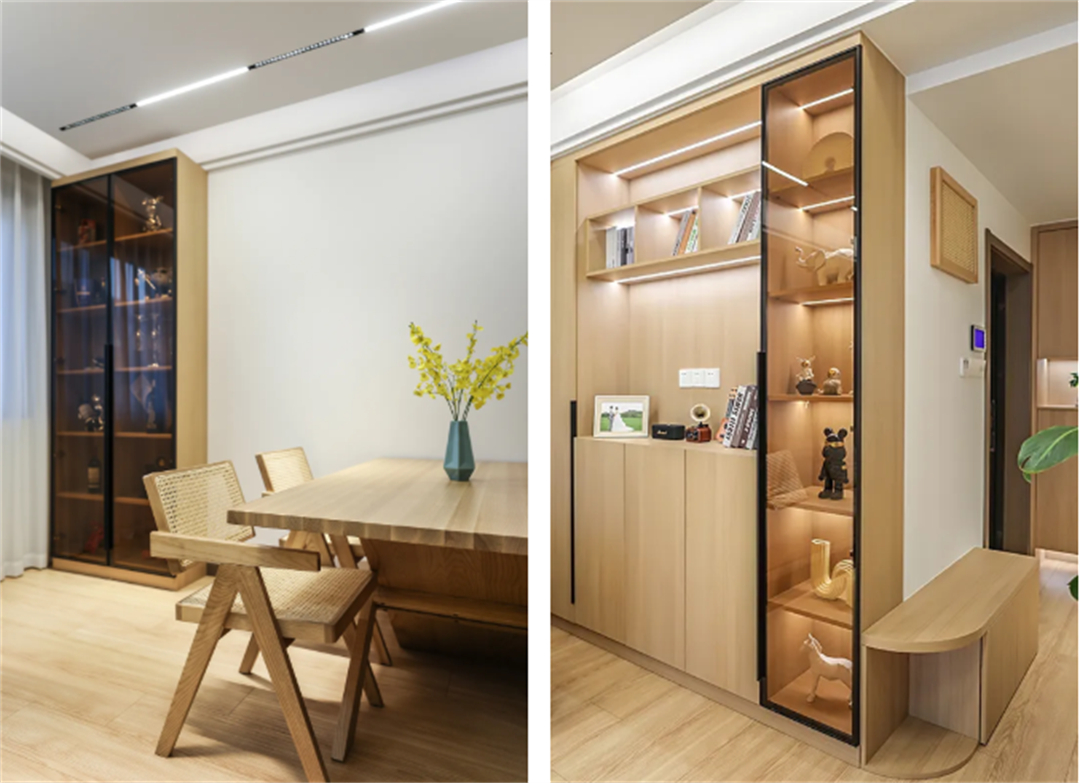 場北路551弄:該套房餐廳特別定制餐邊柜,白色柜體搭配玻璃門,既展現了物品的整齊擺放,又增添了空間的通透感。中間開放式儲物格便于取放常用物品,上方封閉柜門則提供了充足的隱藏儲物空間。