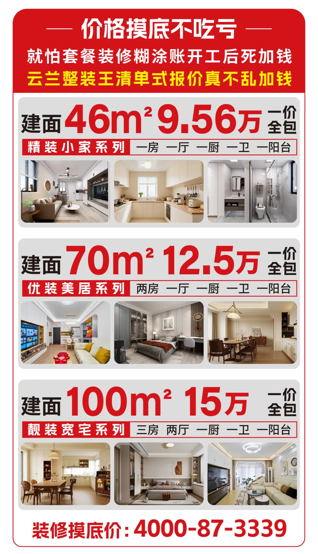 裝修一旦付錢,就被商家輕松拿捏?云蘭整裝王能深刻理解業(yè)主的被動(dòng)情況。通過(guò)總結(jié)裝修行業(yè)“低開高走”“增項(xiàng)加錢”的原因,針對(duì)不同戶型推出基于上海裝修市場(chǎng)行情的裝修報(bào)價(jià),并以清單式整裝預(yù)算為依據(jù),承諾“10免10包12不限 32項(xiàng)真全包 不加錢”,保障給到的套餐報(bào)價(jià),就是完工后的裝修總花費(fèi)。