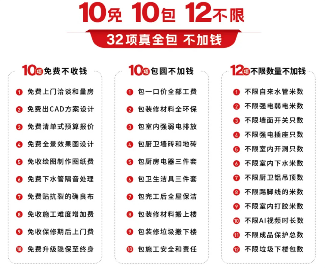 為了解決這一問題,云蘭整裝王制定了“10免10包12不限”的服務(wù)細(xì)則,幾乎涵蓋了所有可爭(zhēng)議工程。包含10項(xiàng)免費(fèi)不收錢、10項(xiàng)包圓不加錢、12項(xiàng)不限數(shù)量不加錢,共計(jì)32項(xiàng)裝修細(xì)則,以消除客戶對(duì)預(yù)算超支的擔(dān)憂。